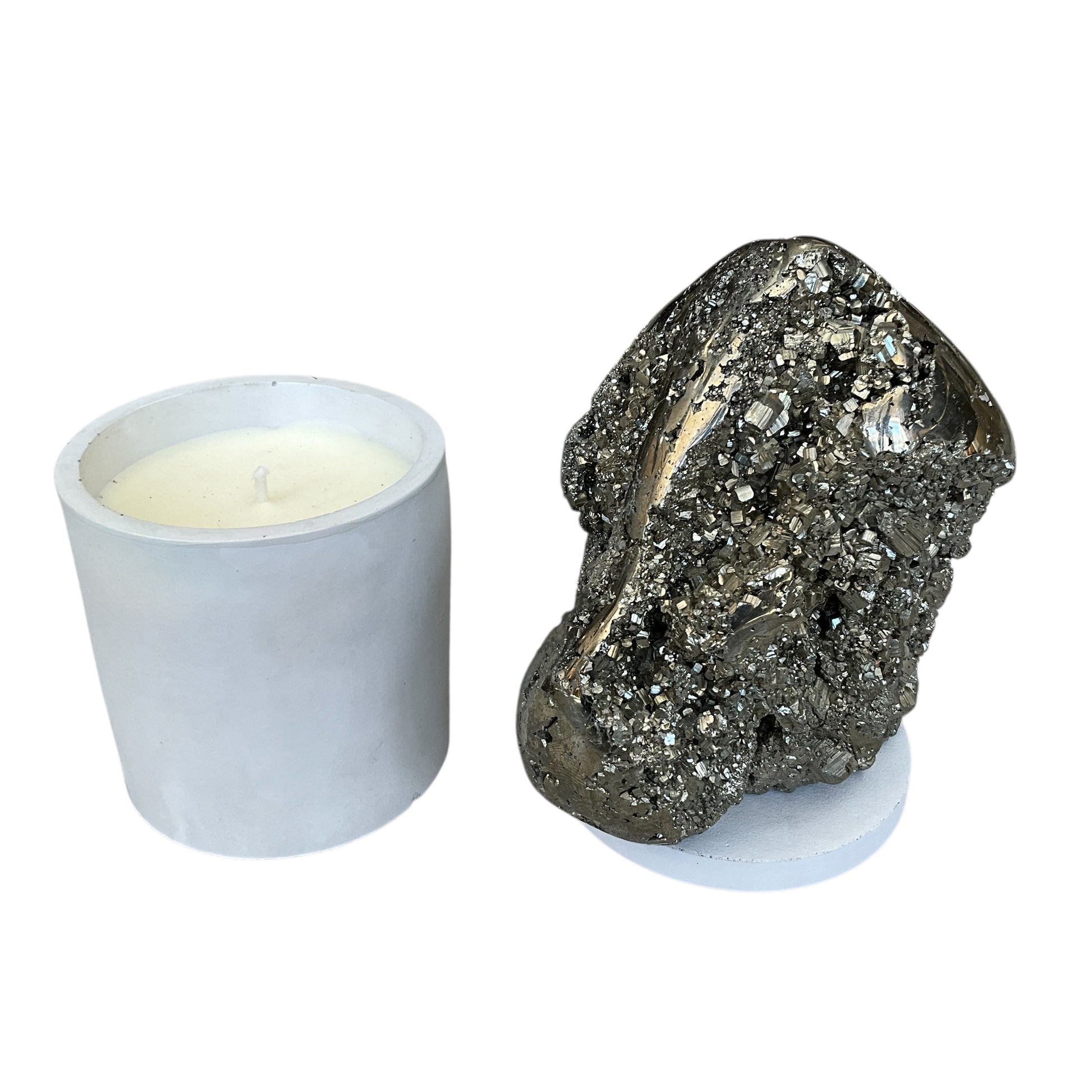 This Candle Features an Abstract Pyrite Cluster on the Lid - the Pyrite measures 5” Wide x 5" Deep x 5.5" Tall giving the candle an overall height of 10.0" with the lid