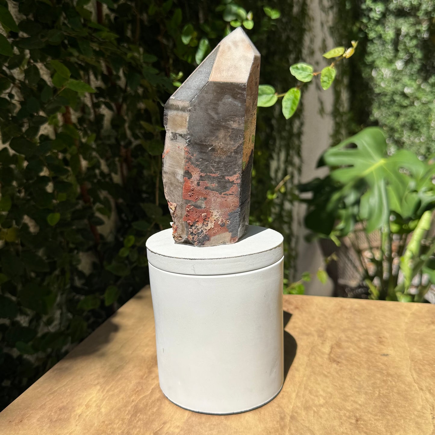 This Candle Features a Smoky Quartz Crystal Generator on the Lid with Various Minerals giving it a unique appearance - the Crystal measures 2.5" Wide x 2.25" Deep x 5.5" Tall giving the candle an overall height of 10” with the lid