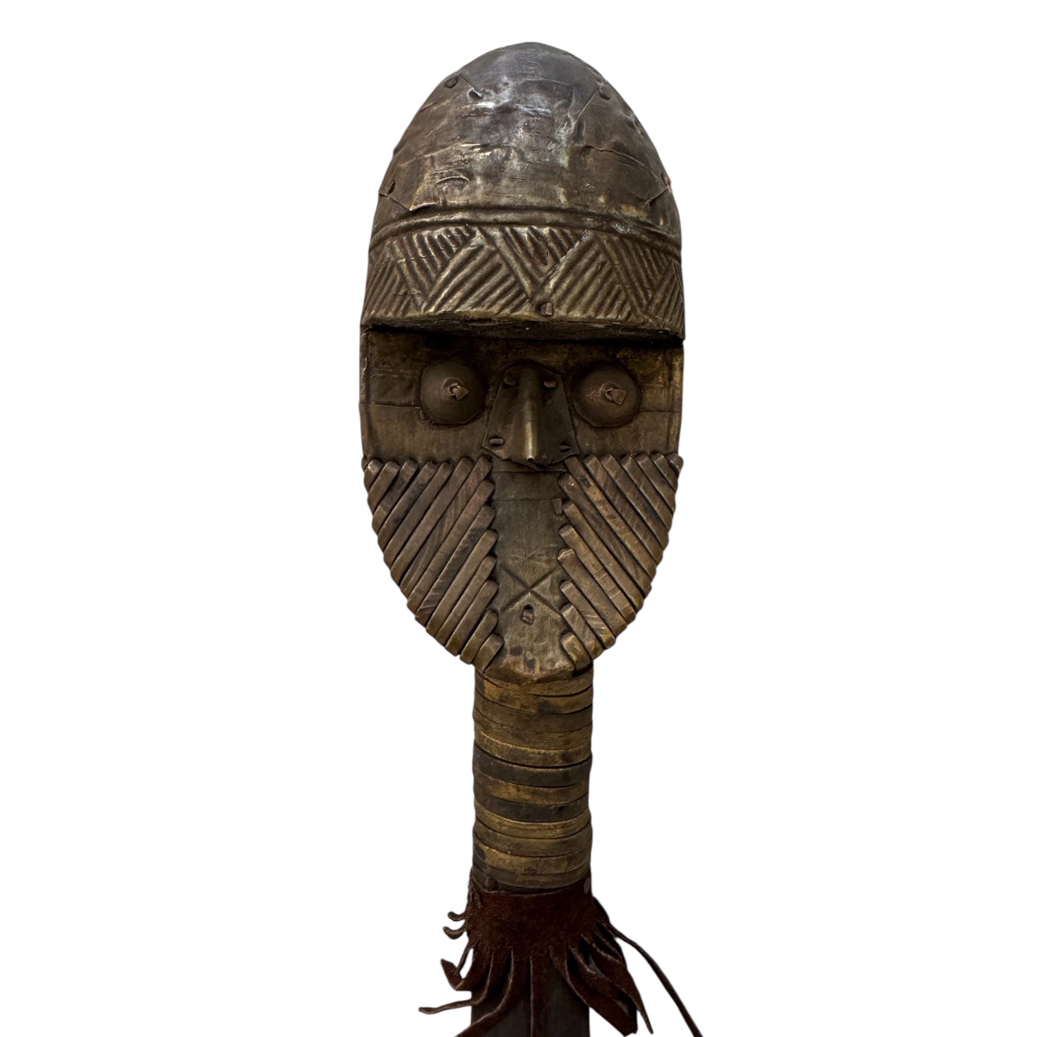 The Bokota, also Kota, people of the Congo and Gabon traditionally placed guardians, called Mbulu Ngulu. Reliquary figures are typically carved of wood and covered with intricately woven strips of copper, brass, and bronze.