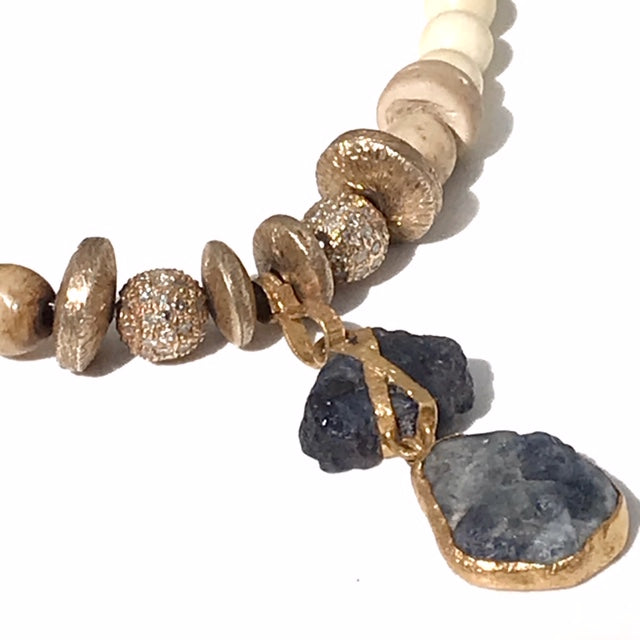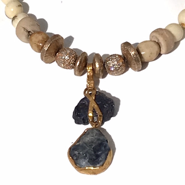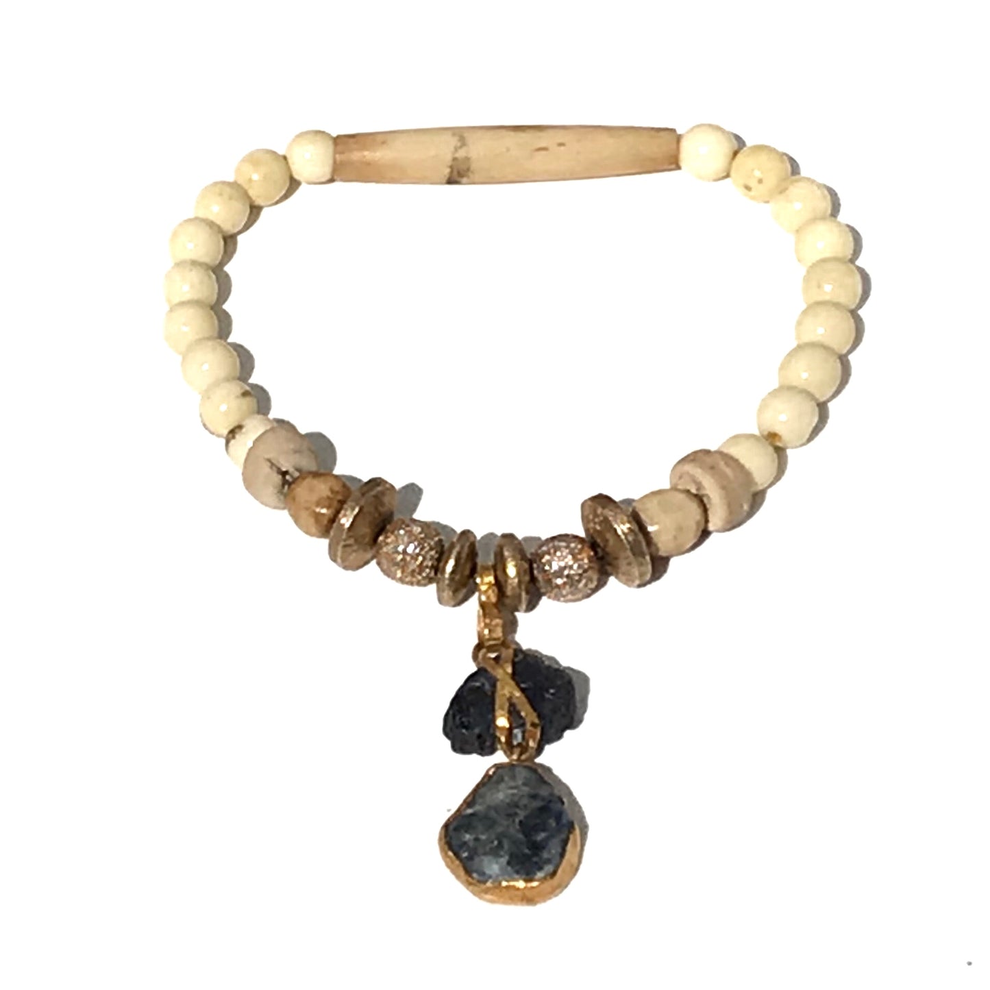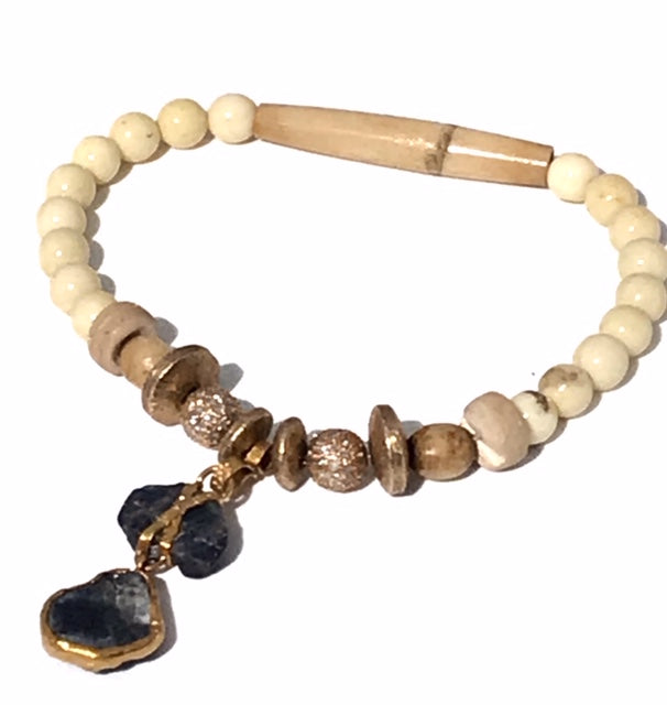 Bone Bead Bracelet with Wood Beads, Gold Beads, & Diamonds in Gold Beads