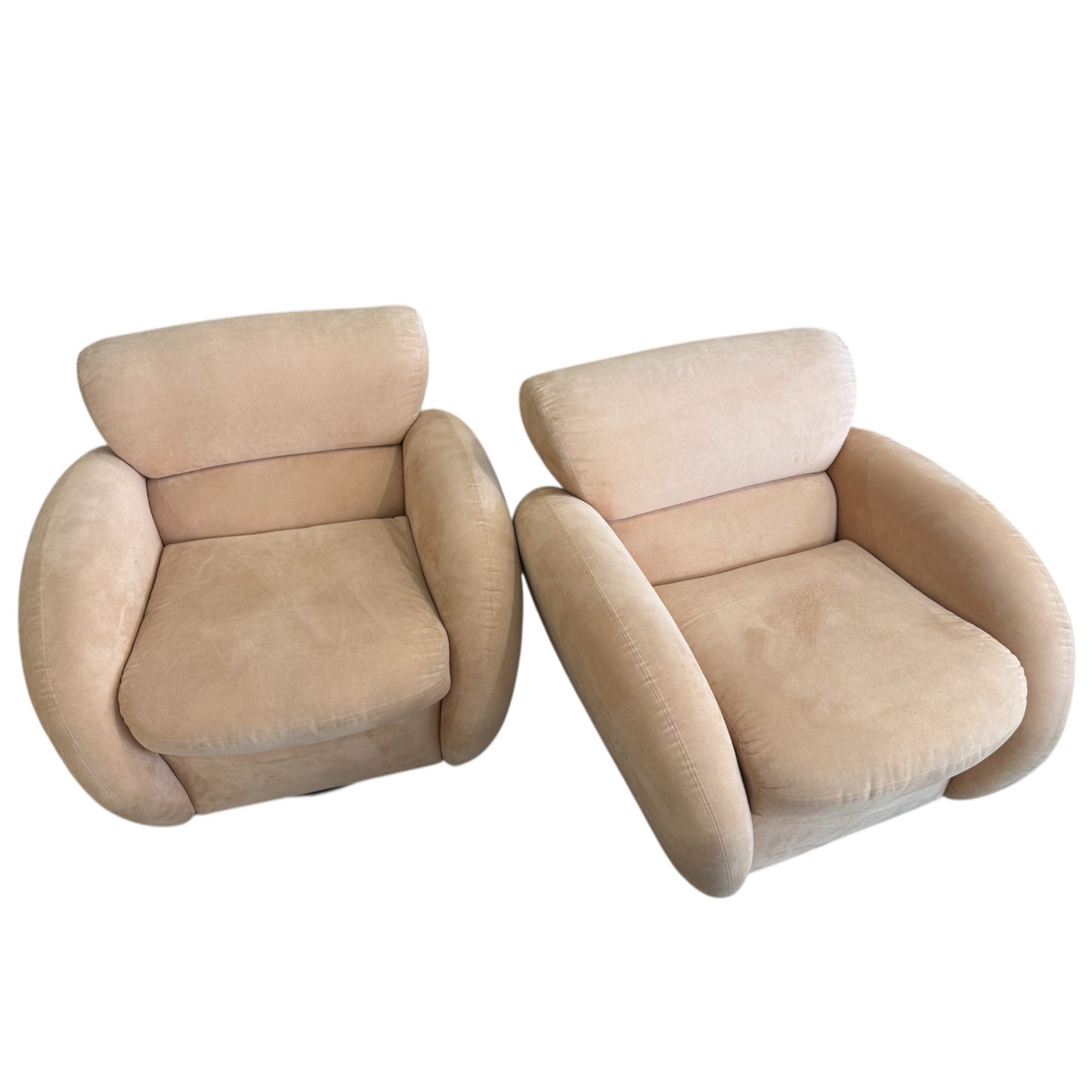 A pair of swivel high-backed arm chairs produced by Directional. Each chair has a hidden black wooden base that swivels with ease.
