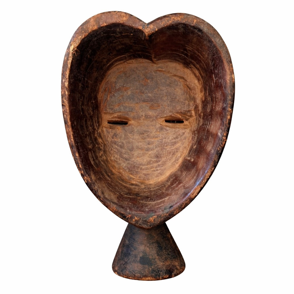 Hand-carved wooden mask with a heart-shaped form and deep, sculpted features. Rich natural patina and visible wear highlight its age and character.