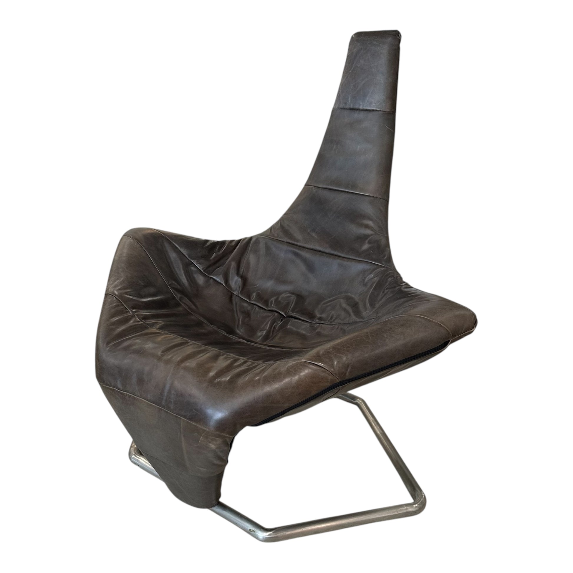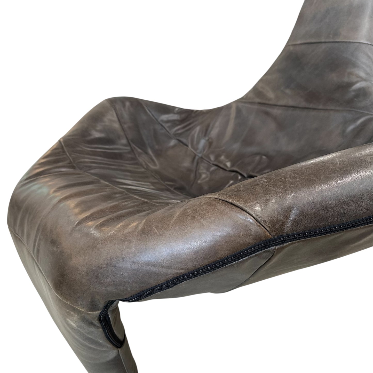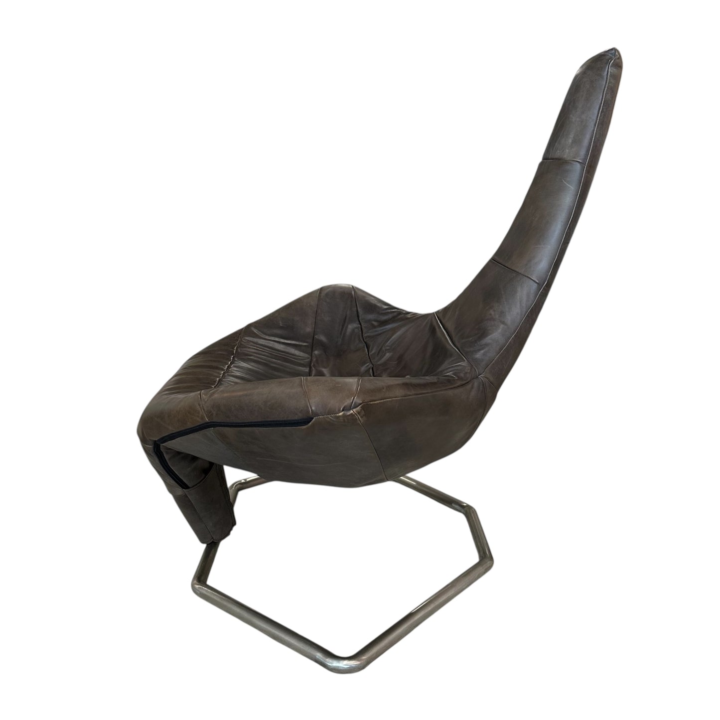 Beautiful sculptural grey leather lounge chair named Turner, and nicknamed "Cobra"; designed by Jack Crebolder for Harvink in the early 1980s in the Netherlands. Although the chair by view may suggest otherwise, it has a truly amazing sitting comfort. It is a full size comfortable lounge chair, but without the massiveness of most big lounge chairs. It stands on one leg attached to a metal floor plate. The lines of the design are so thin that it almost seems as if you look through it; visually it takes up very little space.