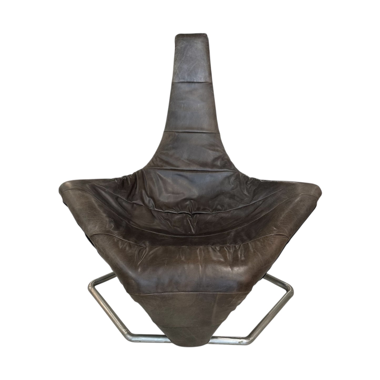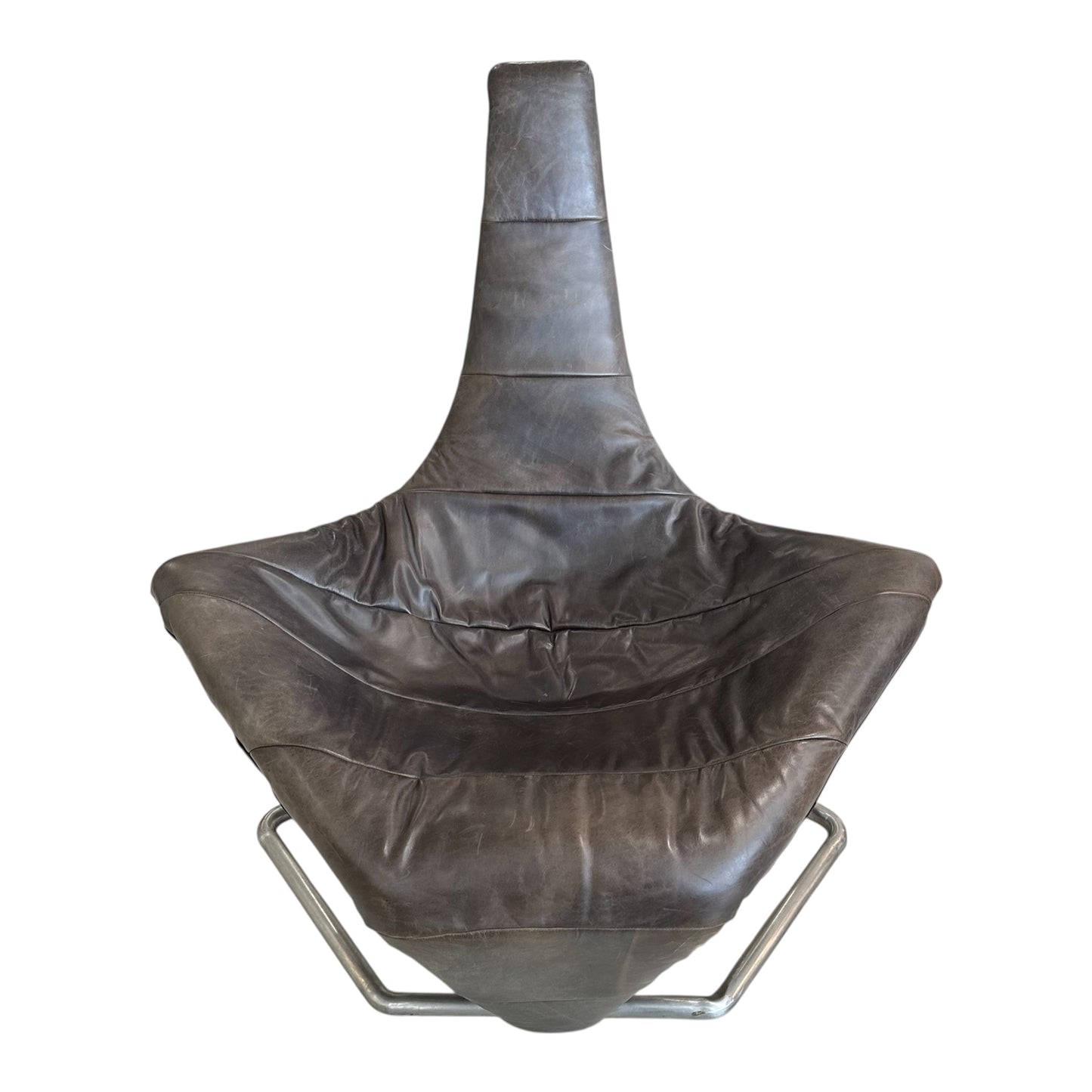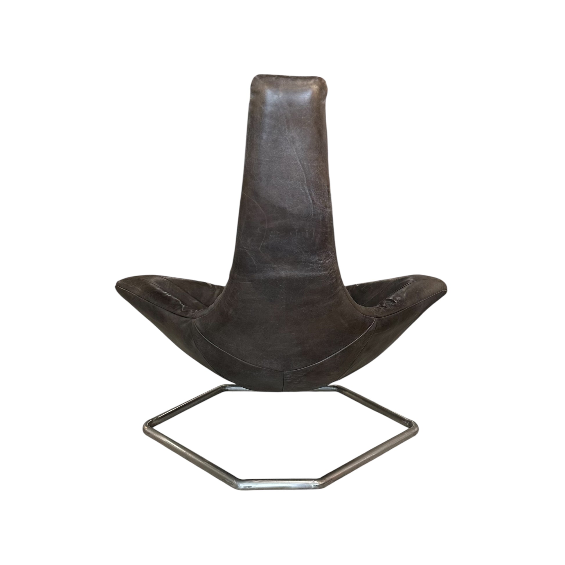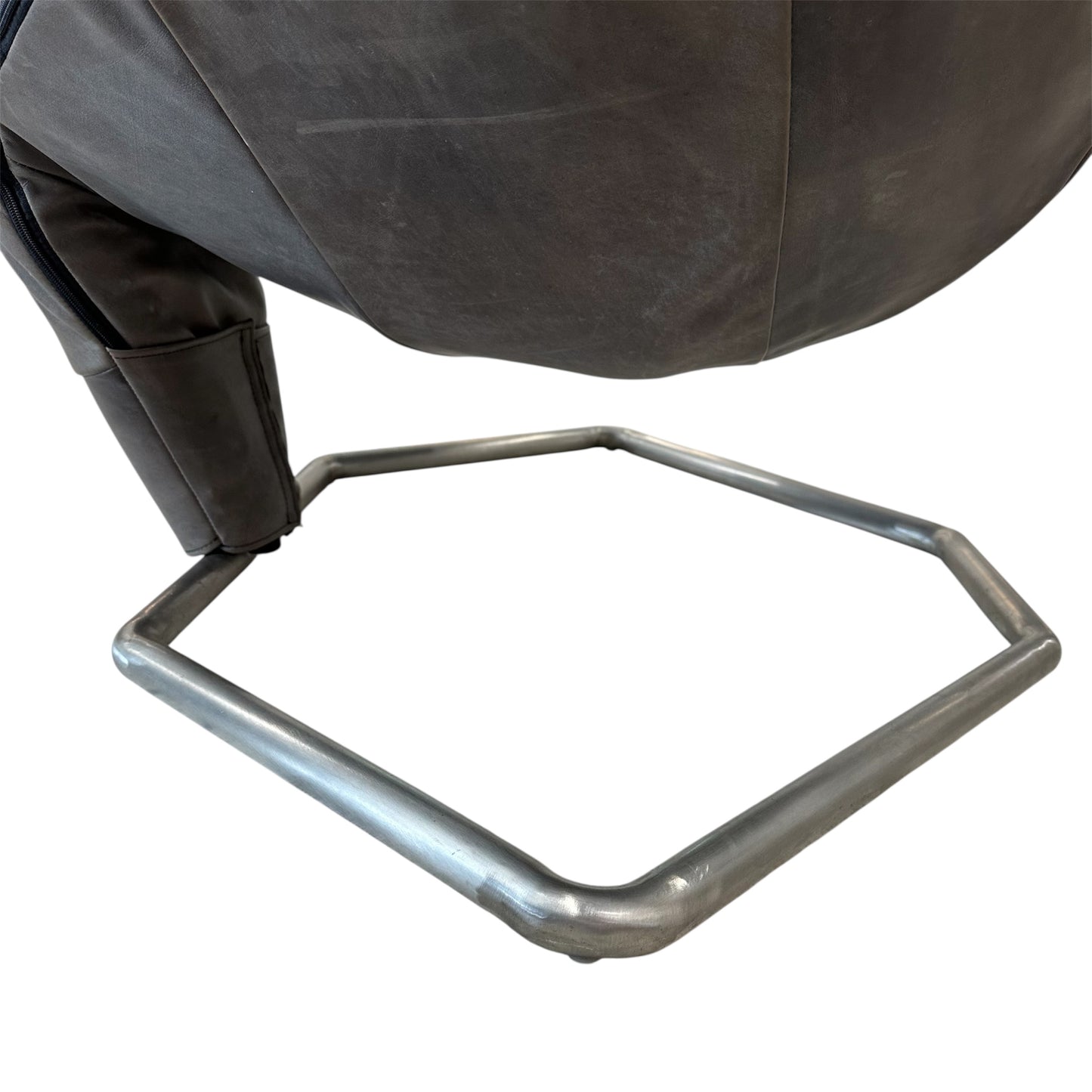 Beautiful sculptural grey leather lounge chair named Turner, and nicknamed "Cobra"; designed by Jack Crebolder for Harvink in the early 1980s in the Netherlands. Although the chair by view may suggest otherwise, it has a truly amazing sitting comfort. It is a full size comfortable lounge chair, but without the massiveness of most big lounge chairs. It stands on one leg attached to a metal floor plate. The lines of the design are so thin that it almost seems as if you look through it; visually it takes up very little space.
