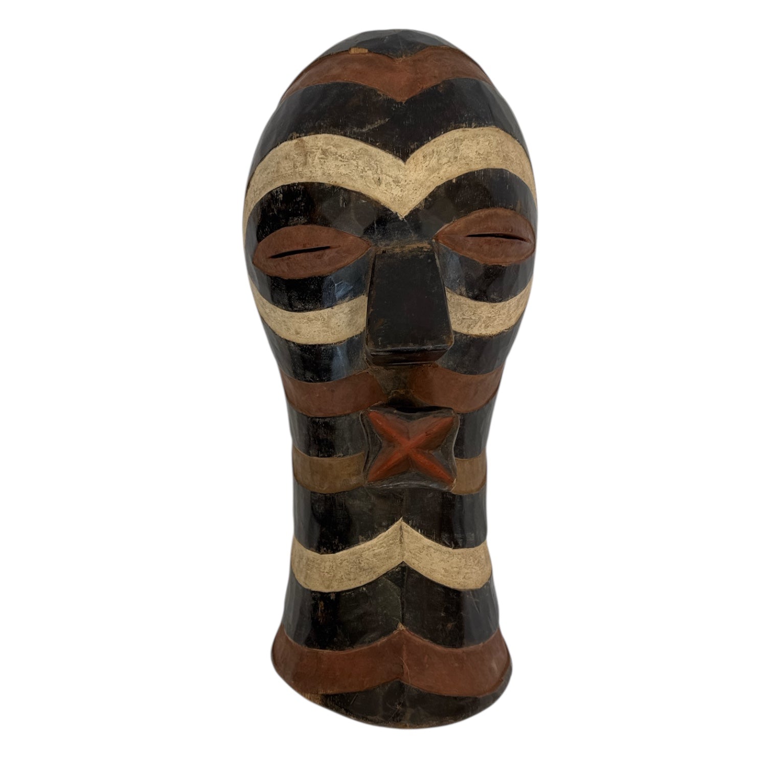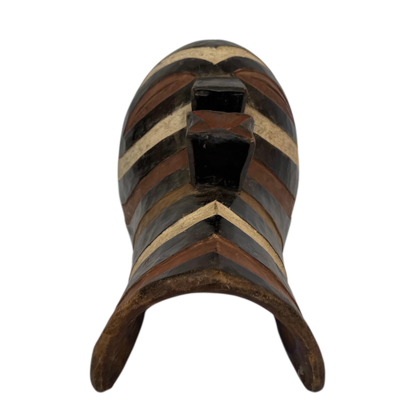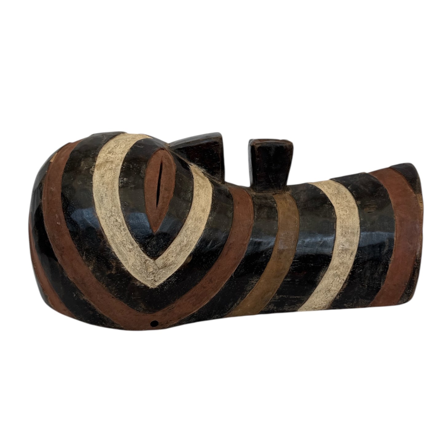 Red slit eyes. Square red/black mouth. Black chunk nose. Stripes are Black, Beige, Red, and Sand.