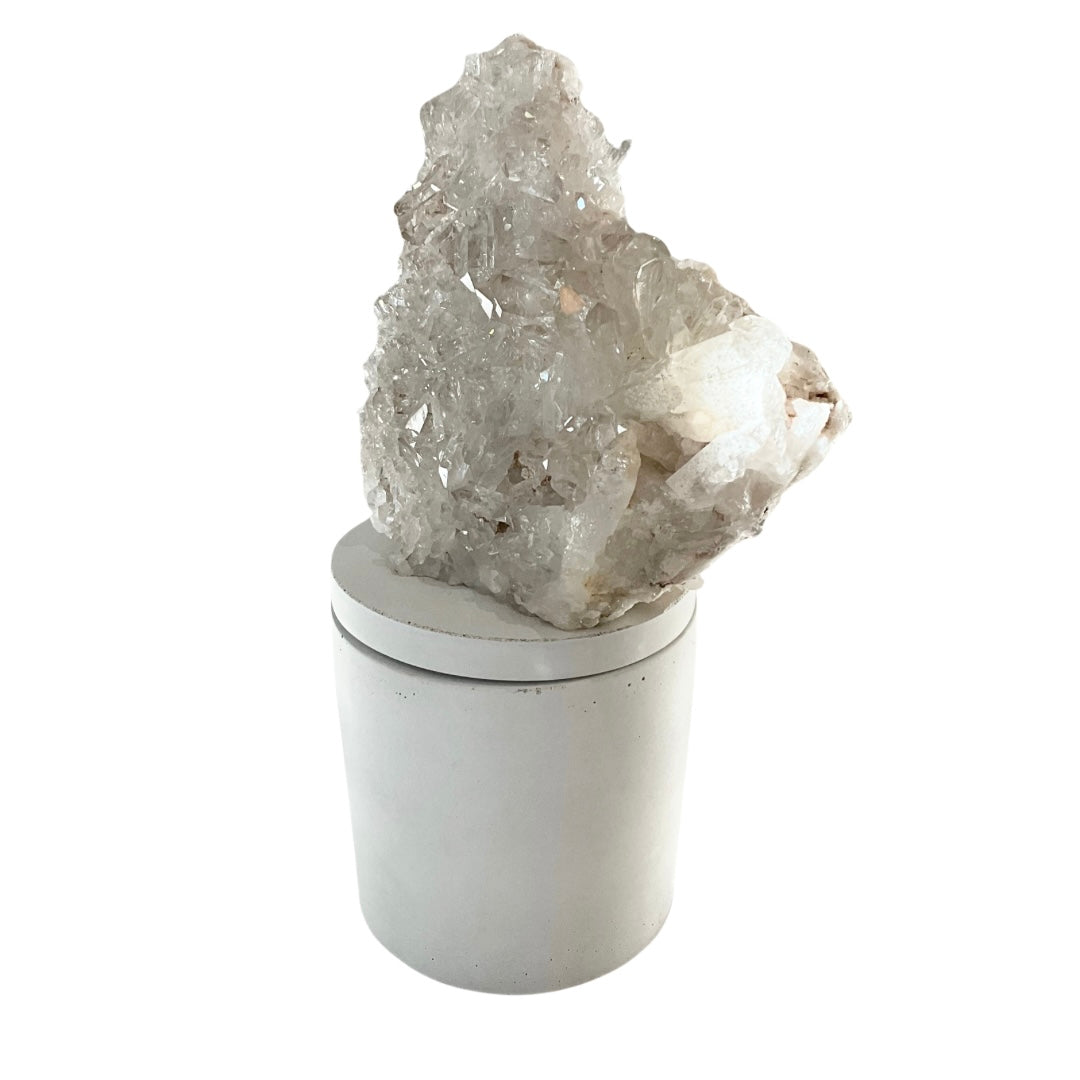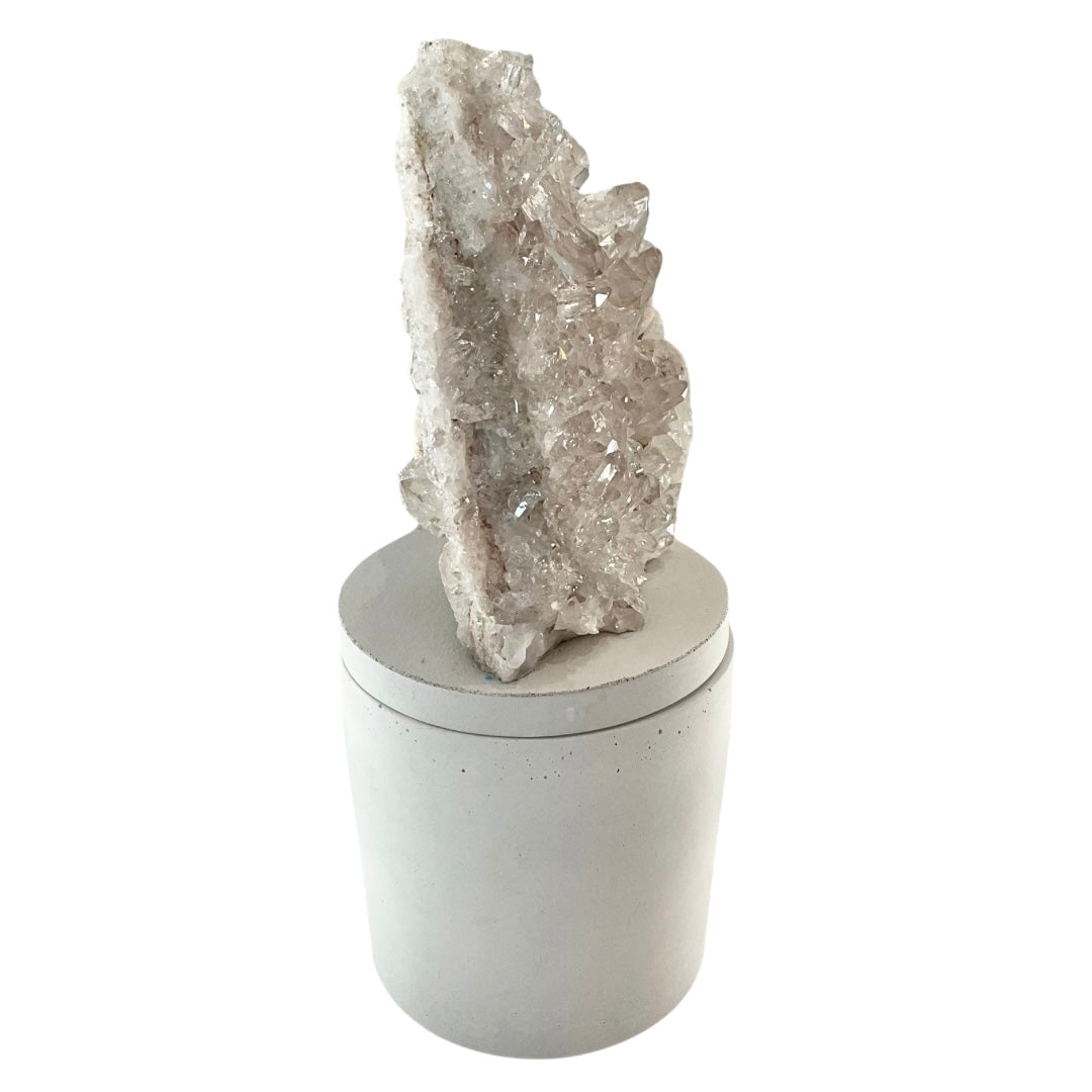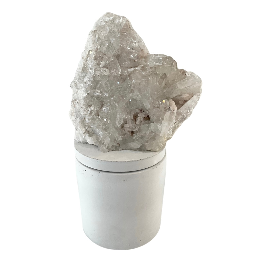 This Candle Features a Quartz Crystal Generator Cluster on the Lid - the Crystal measures 5.5” Wide x 3" x Deep x 5" Tall giving the candle an overall height of 9.5” with the lid