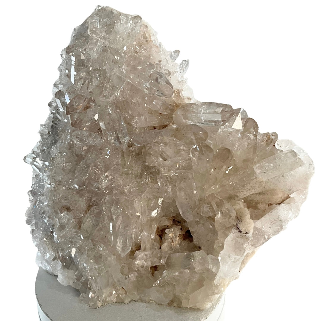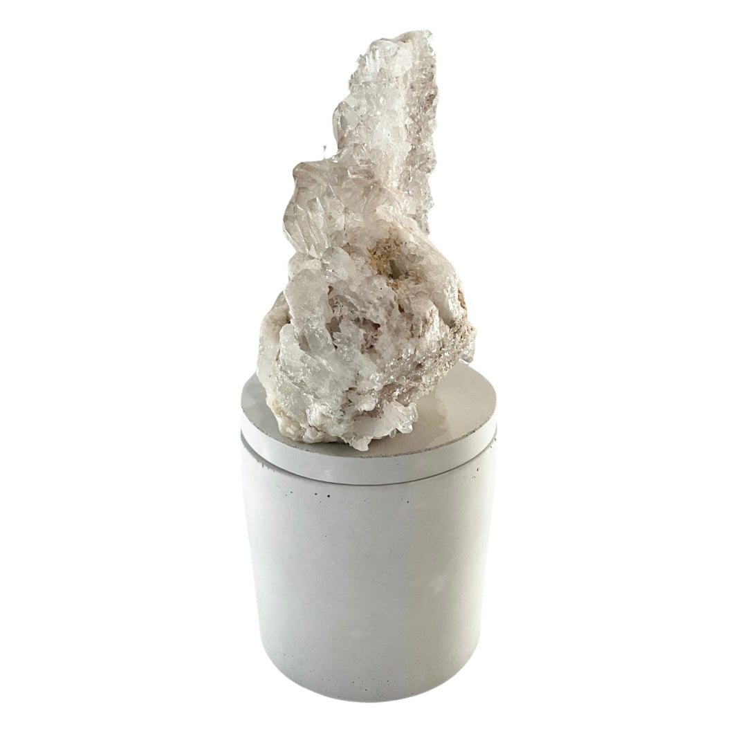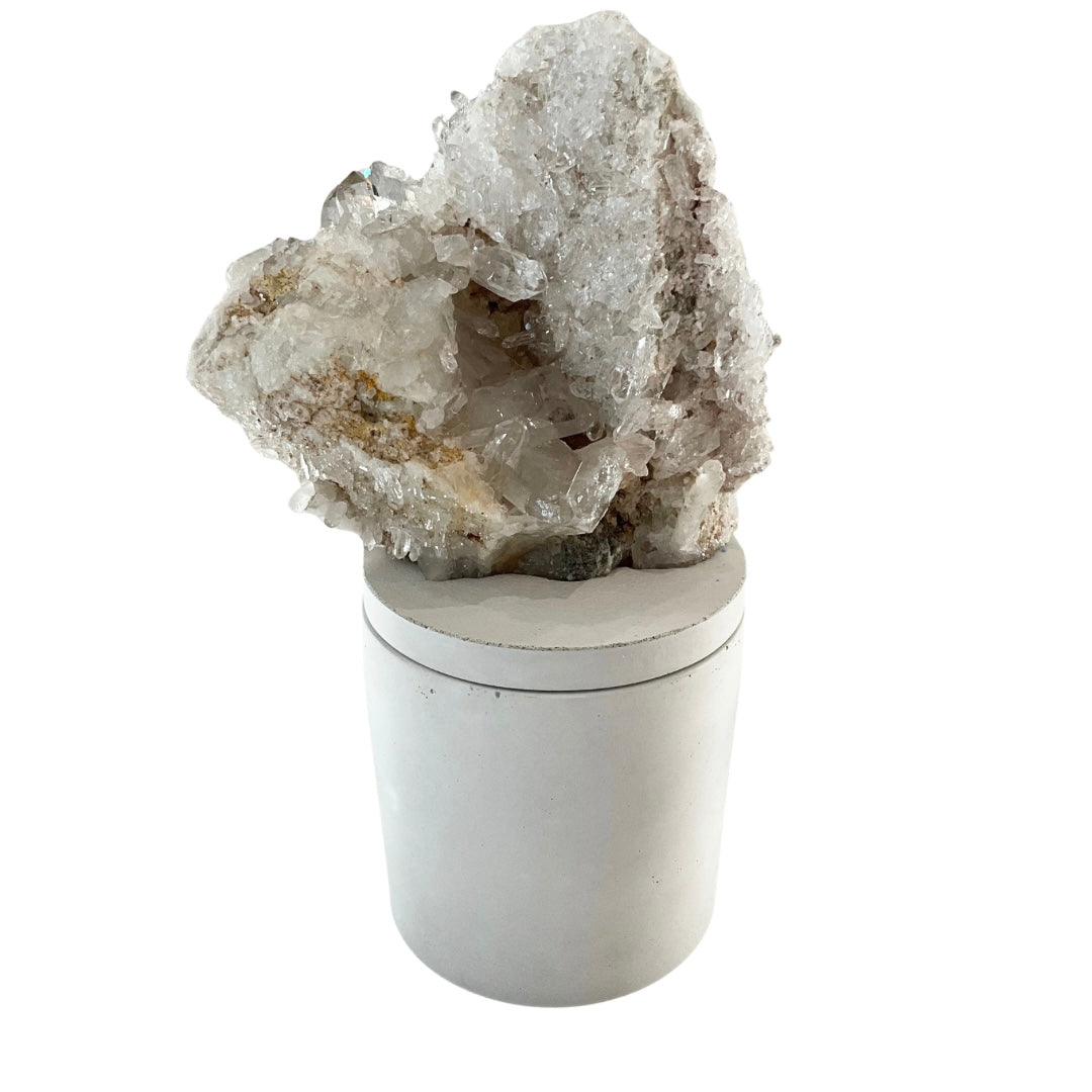 This Candle Features a Quartz Crystal Generator Cluster on the Lid - the Crystal measures 5.5” Wide x 3" x Deep x 5" Tall giving the candle an overall height of 9.5” with the lid