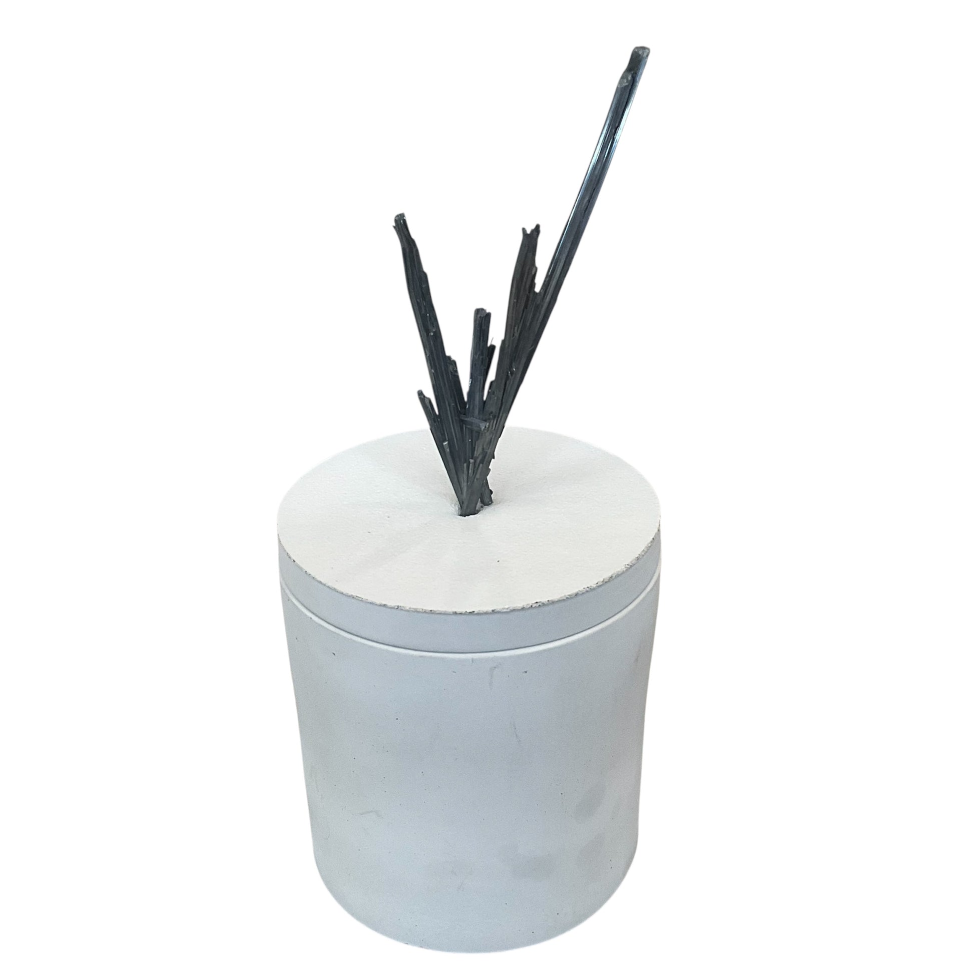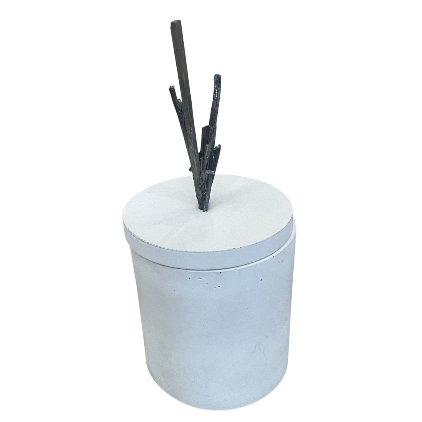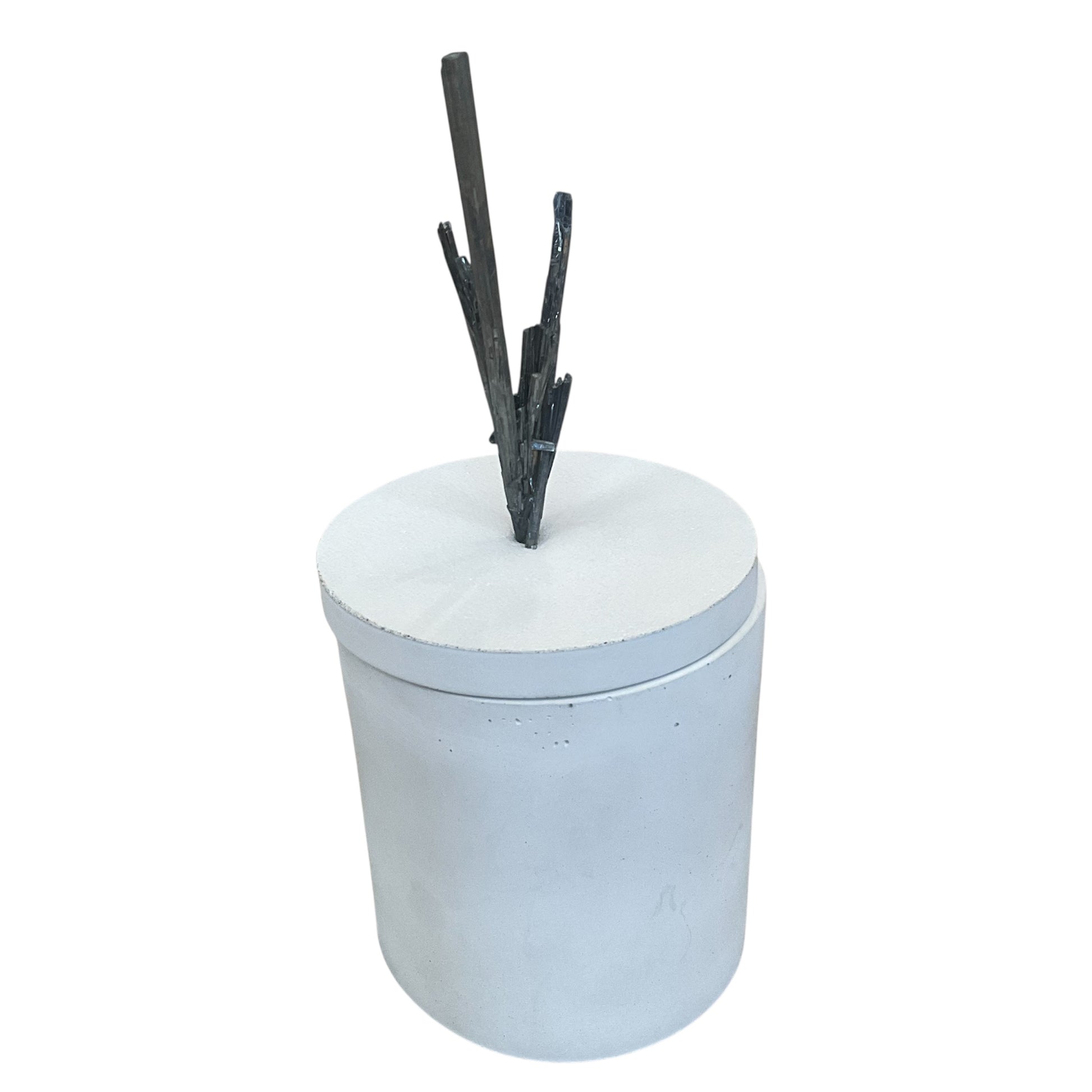This Candle Features a Stibnite Mineral on the lid - the Stibnite measures 2.5" Wide &