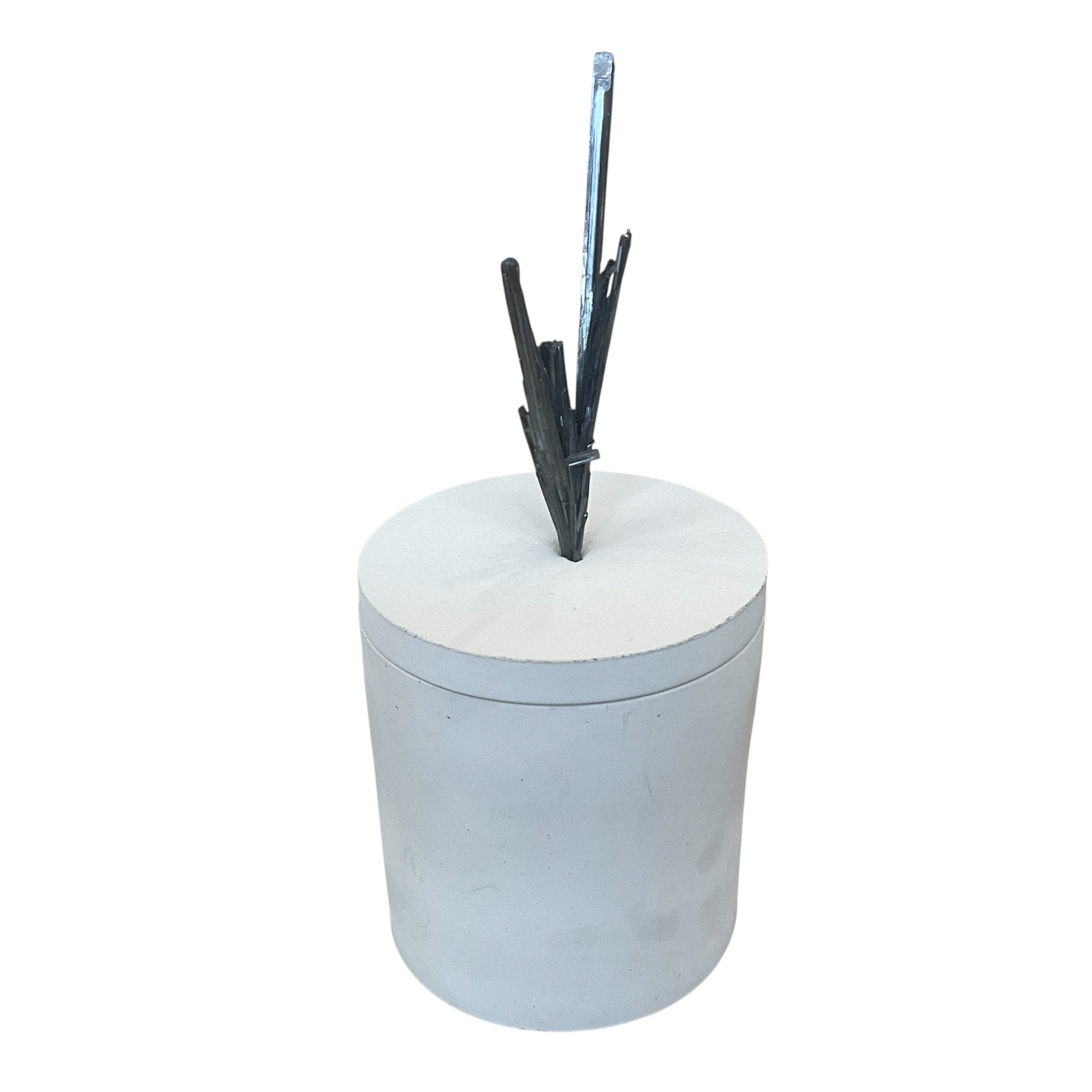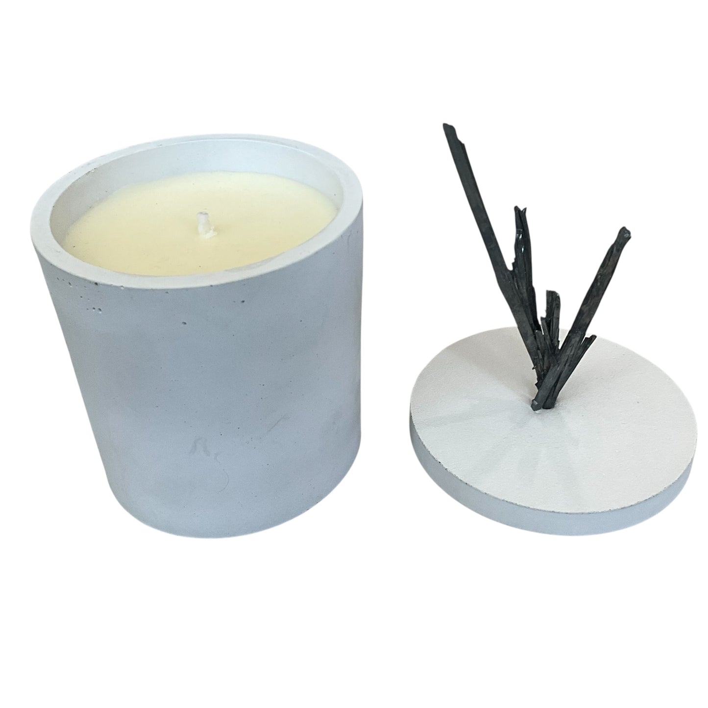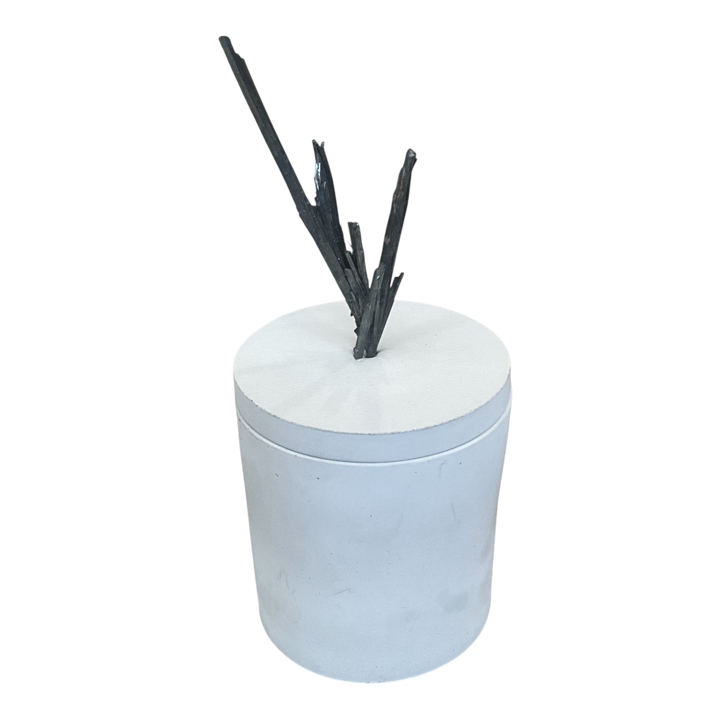 This Candle Features a Stibnite Mineral on the lid - the Stibnite measures 2.5" Wide &