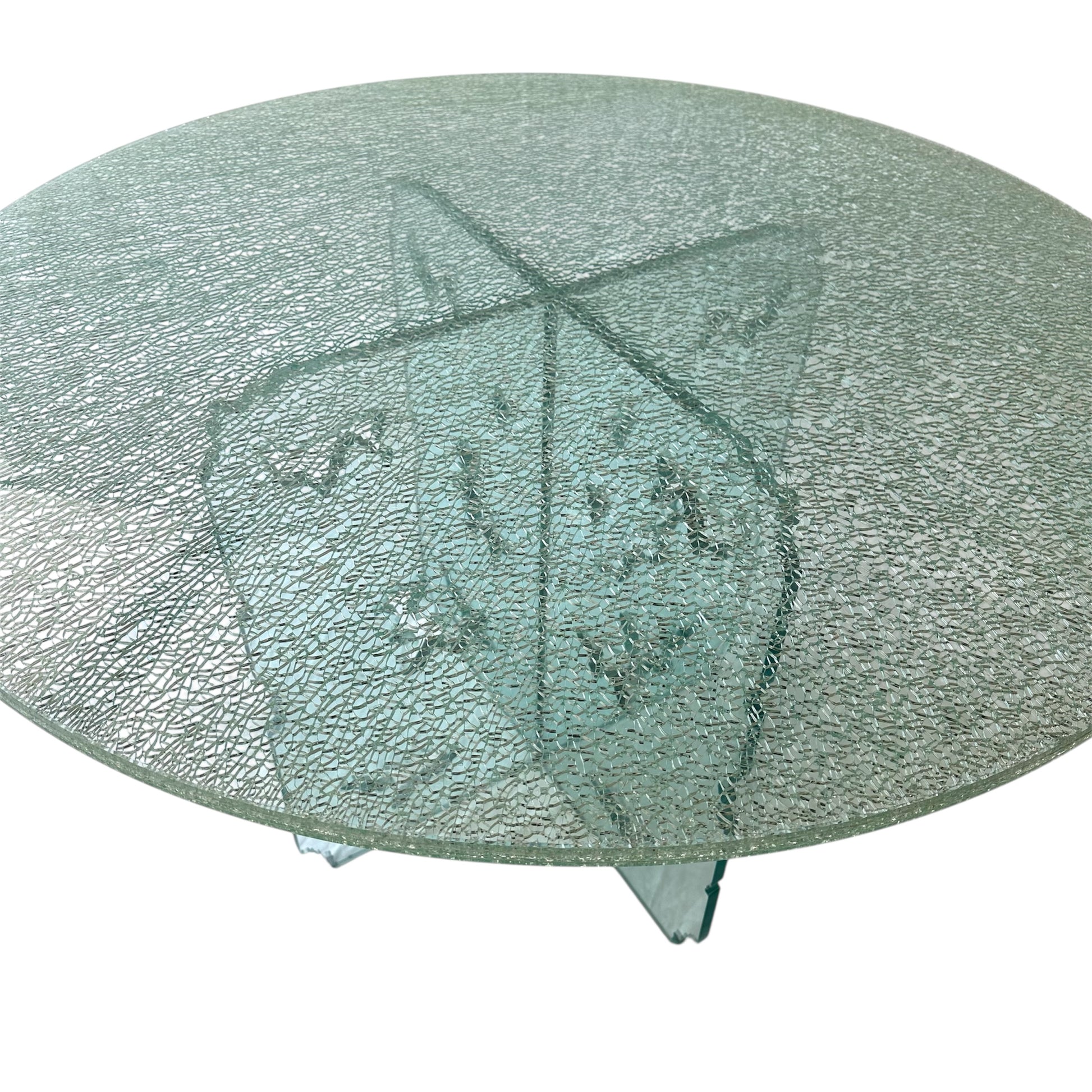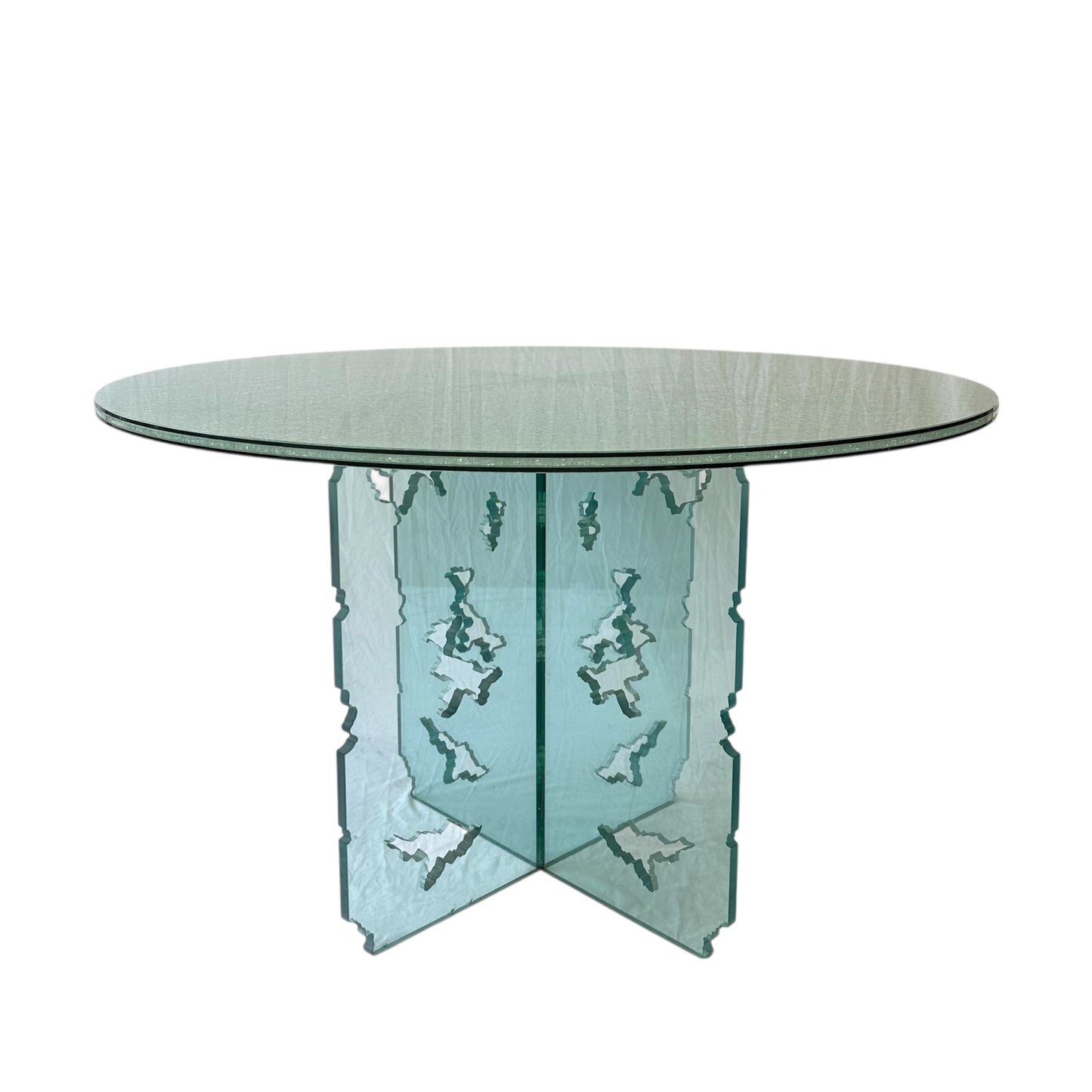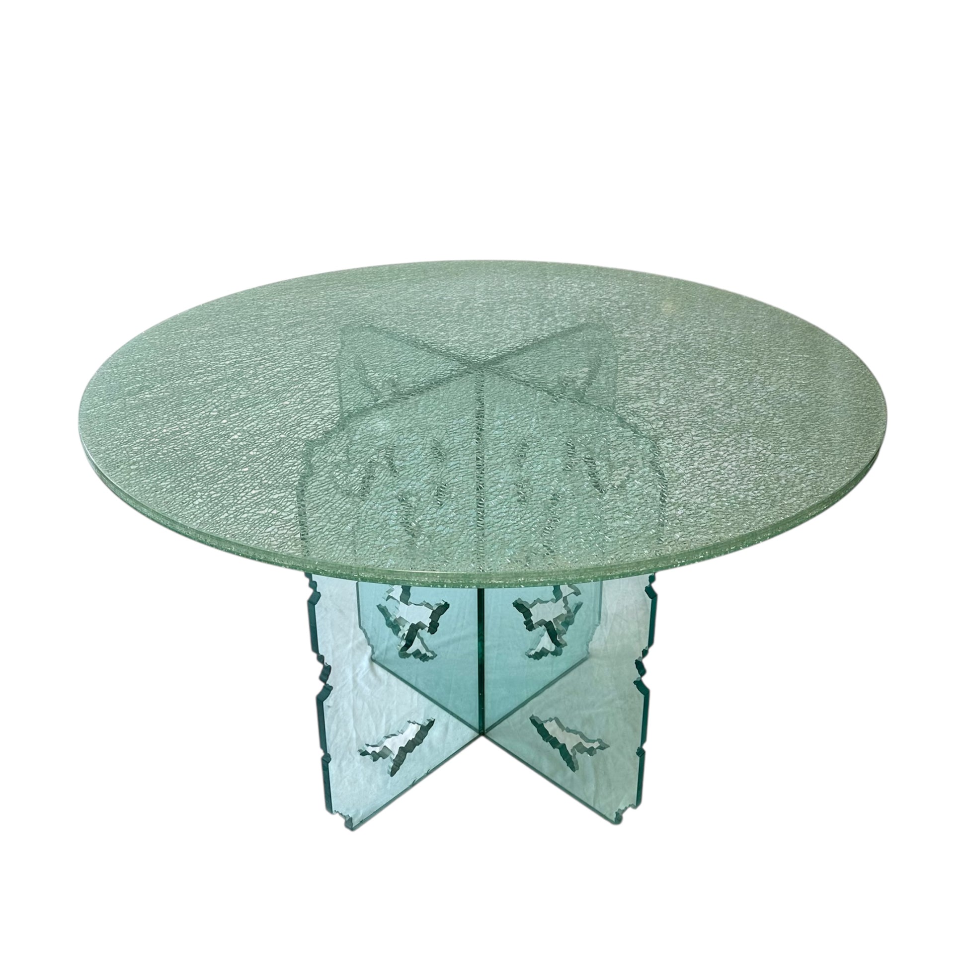 Rare Light Turquoise Green Crackled Glass Dining Table with Unique Cutout Base and Round Table Top