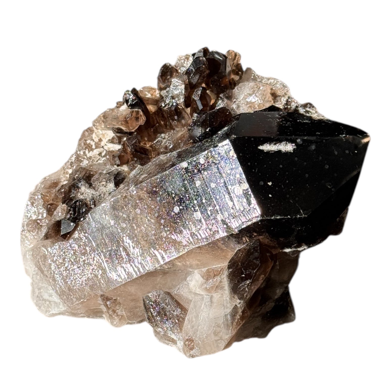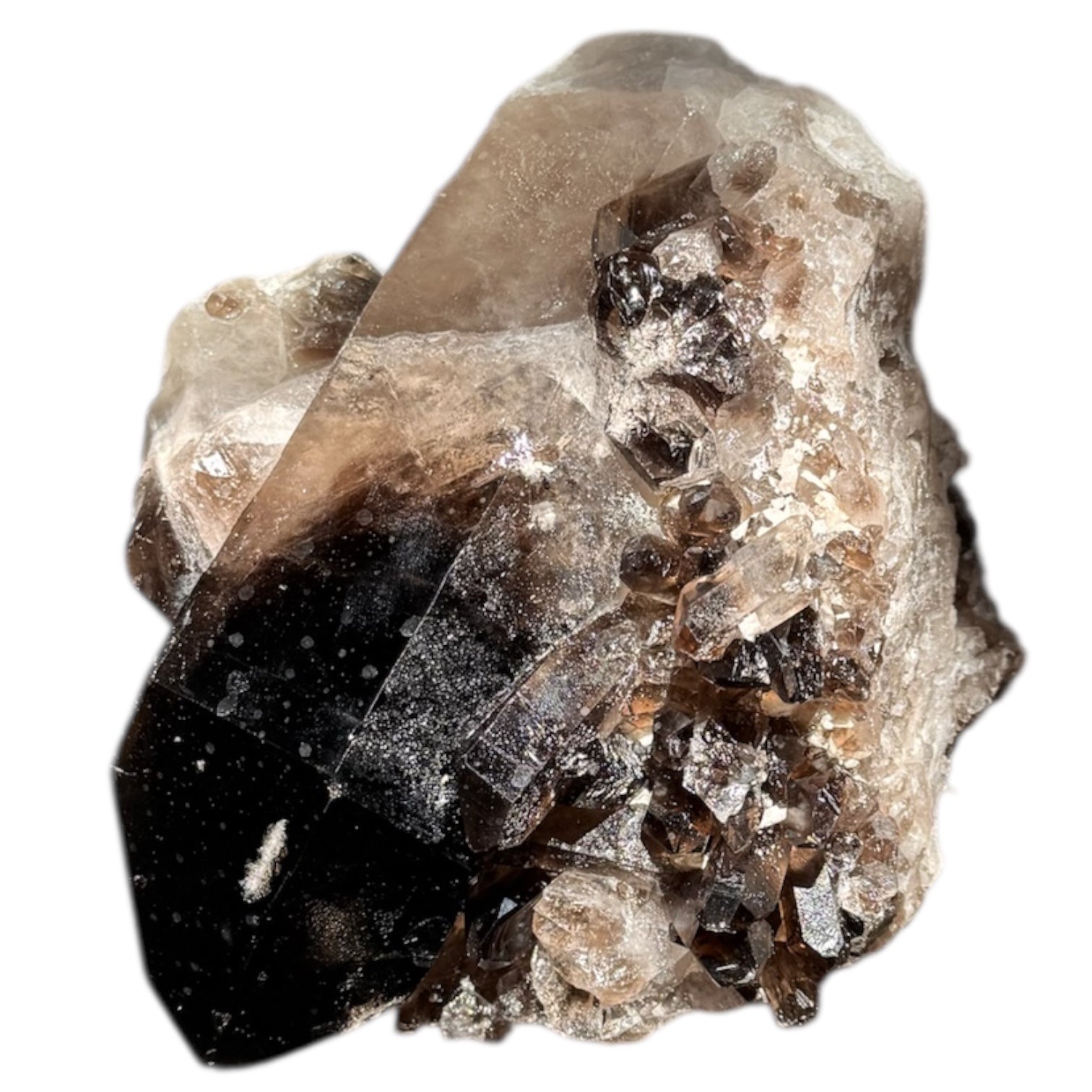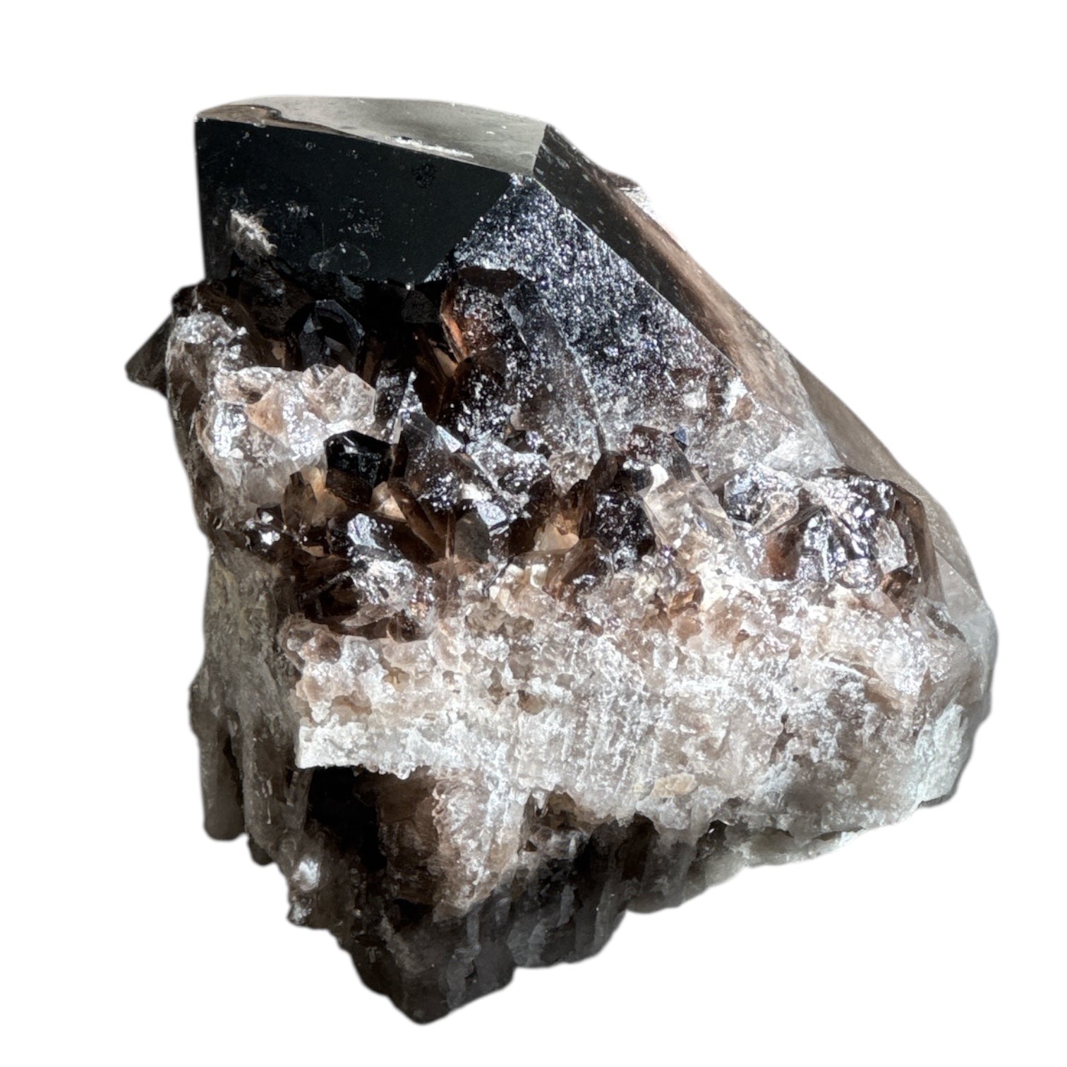 Downward large smoky quartz generator with small generators free standing crystal cluster