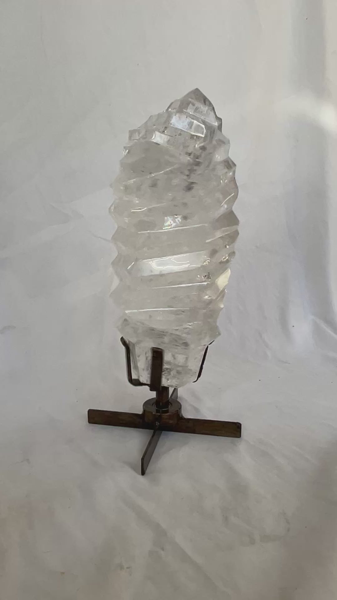 Polished Clear Quartz Crystal w/ grooves on Spinning Stand
