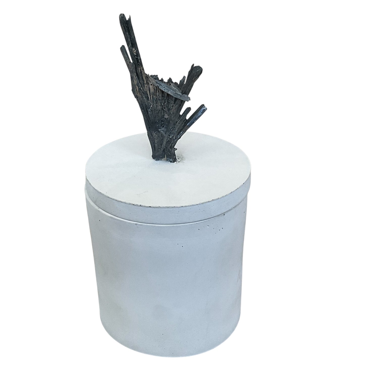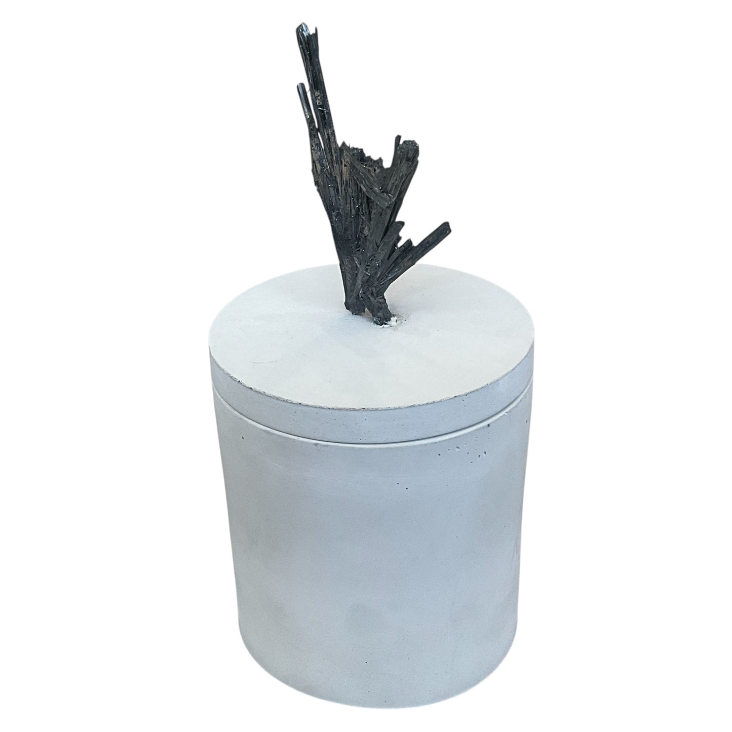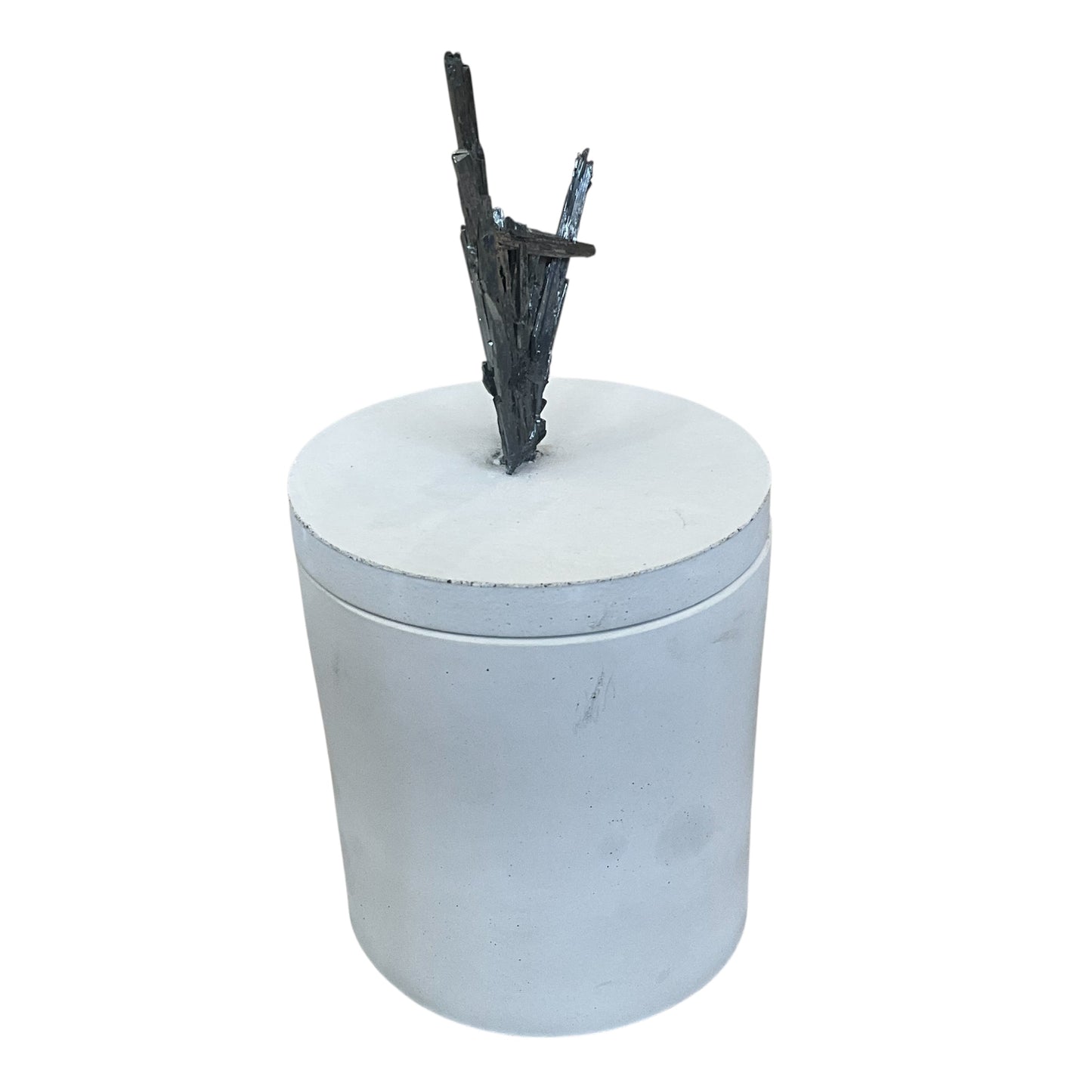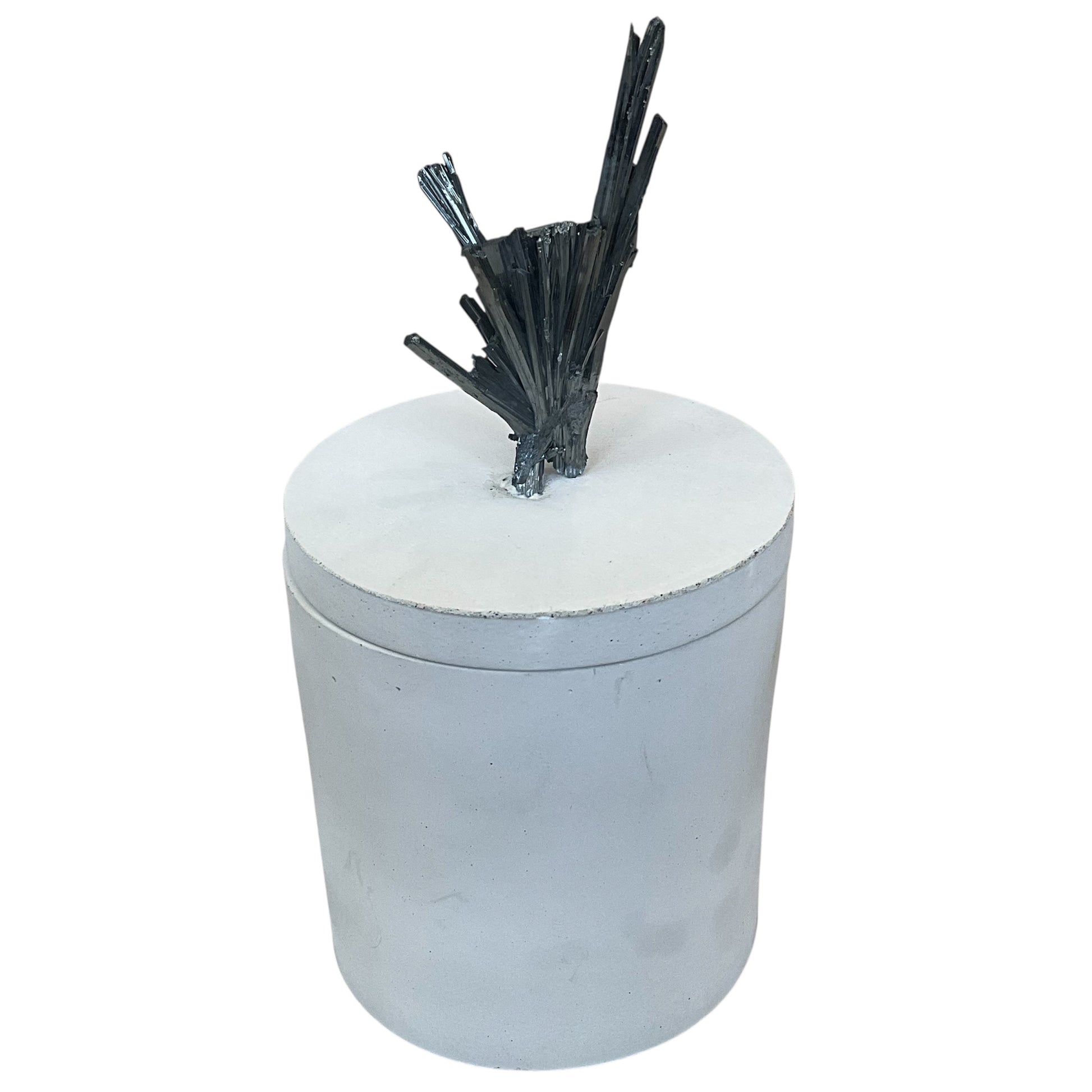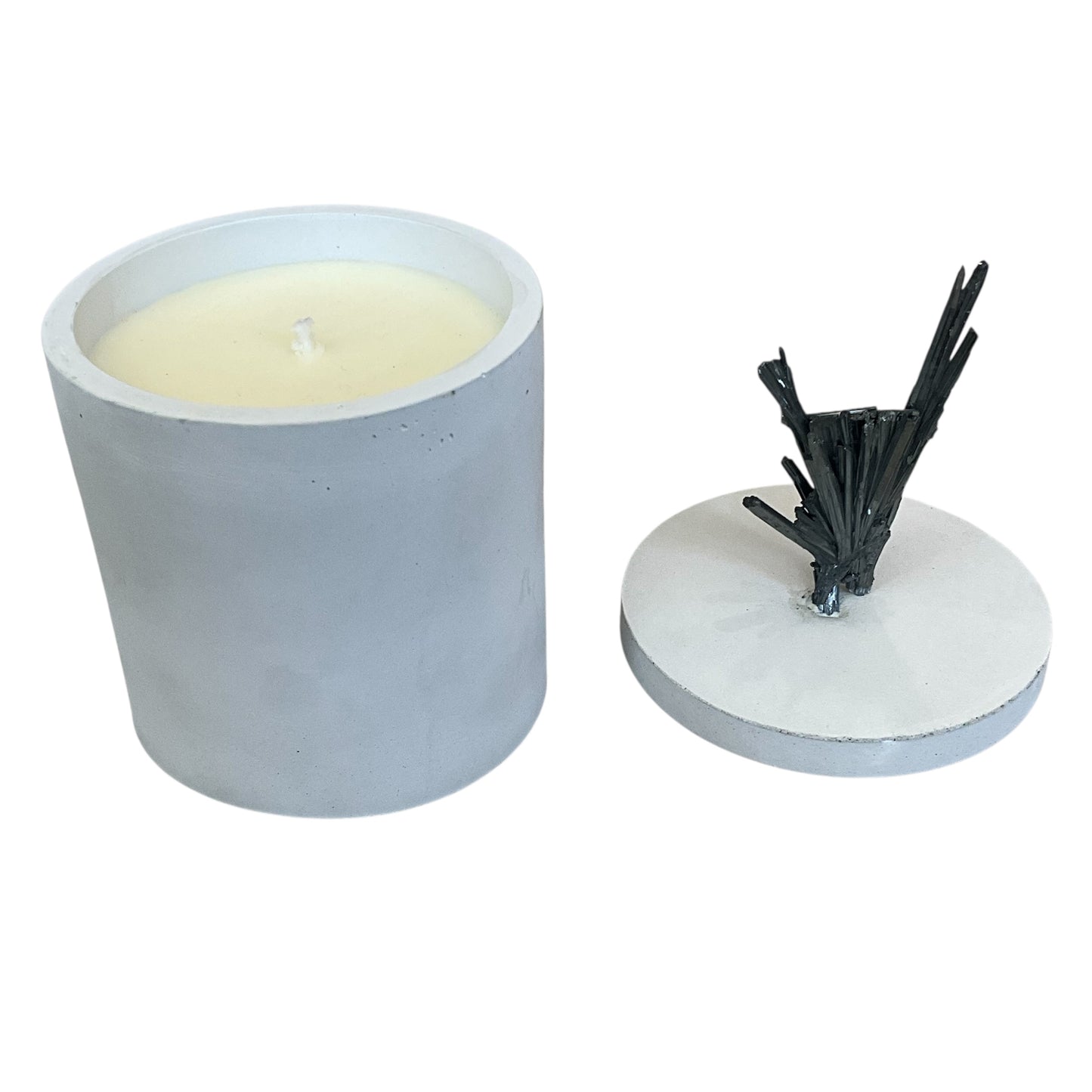 This Candle Features a Stibnite Mineral on the lid - the Stibnite measures 1.75" Wide &