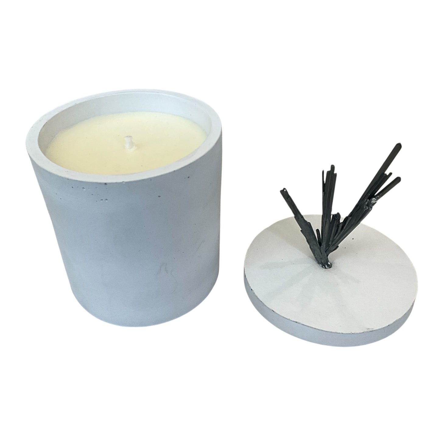 This Candle Features a Stibnite Mineral on the lid - the Stibnite measures 2.5" Wide &