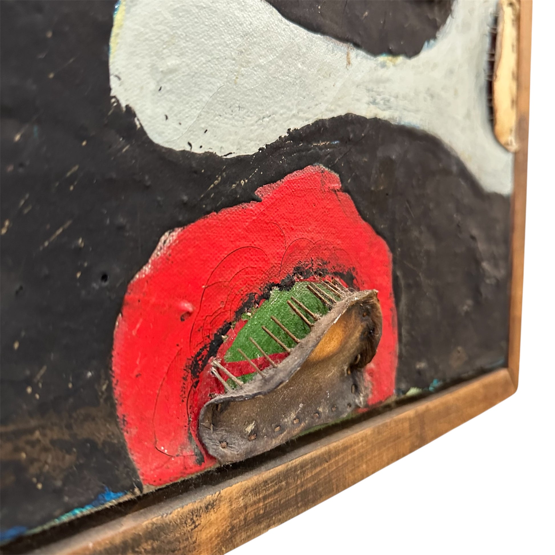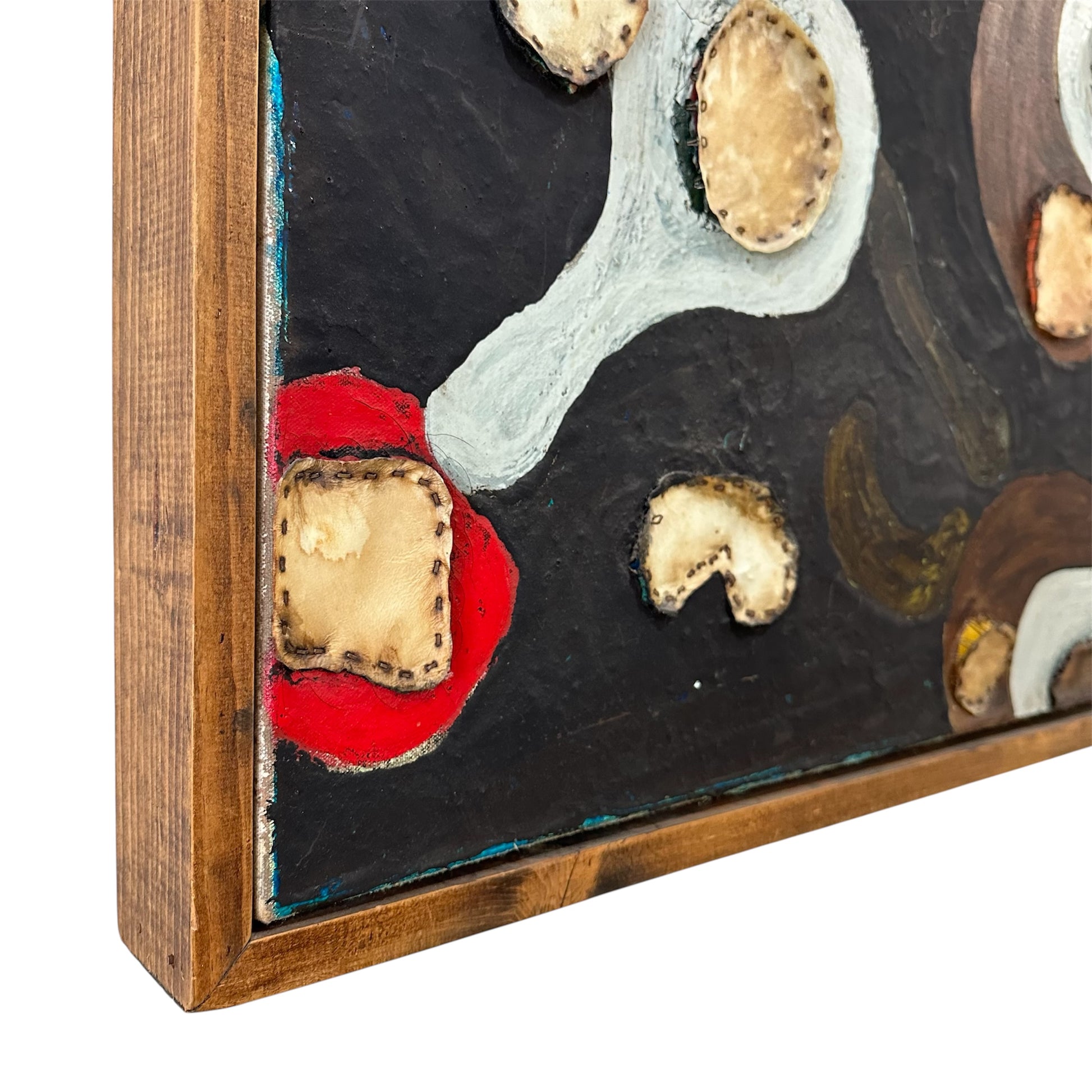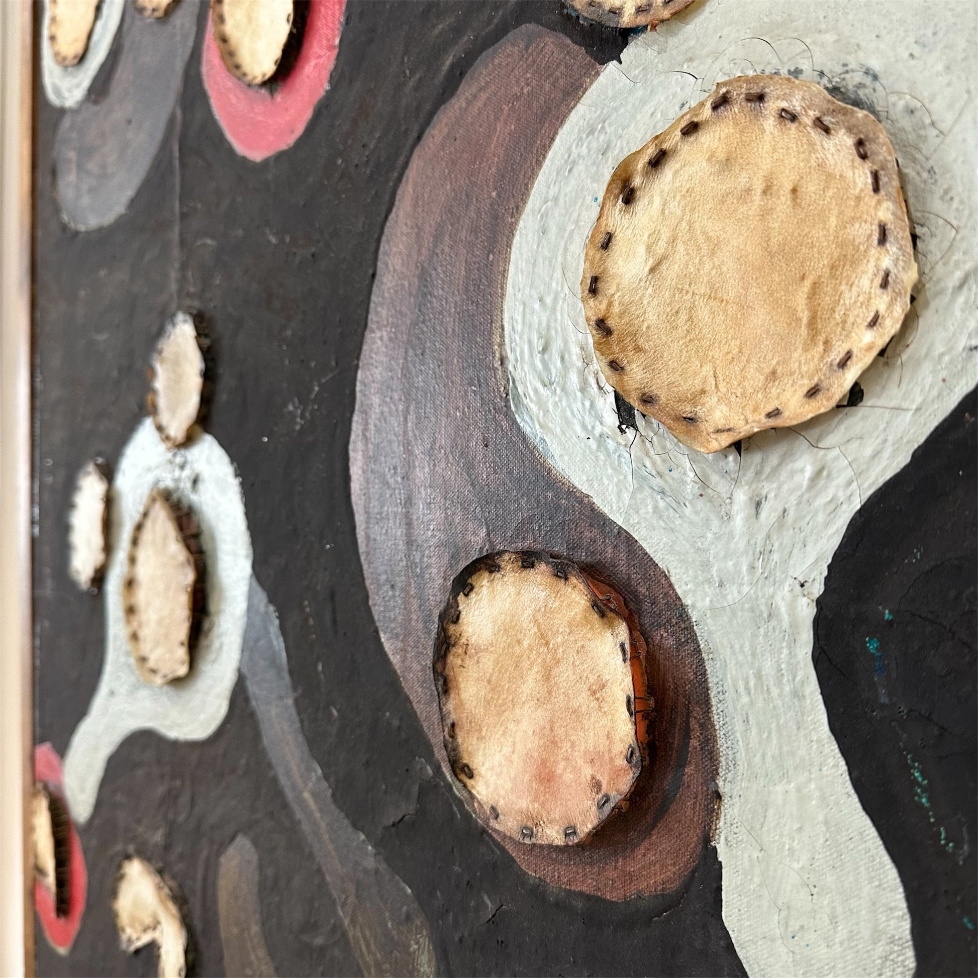 Medium: Rawhide, wood, asphaltum, pigment, urethane, brass staples, oil paint