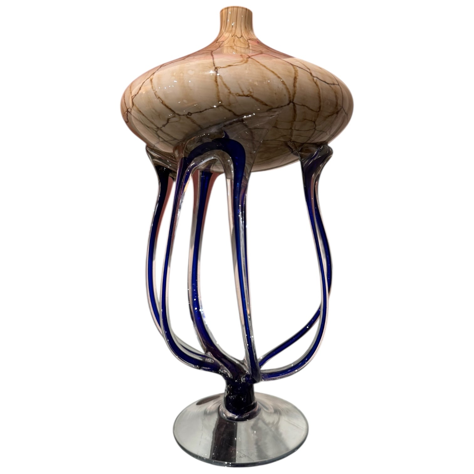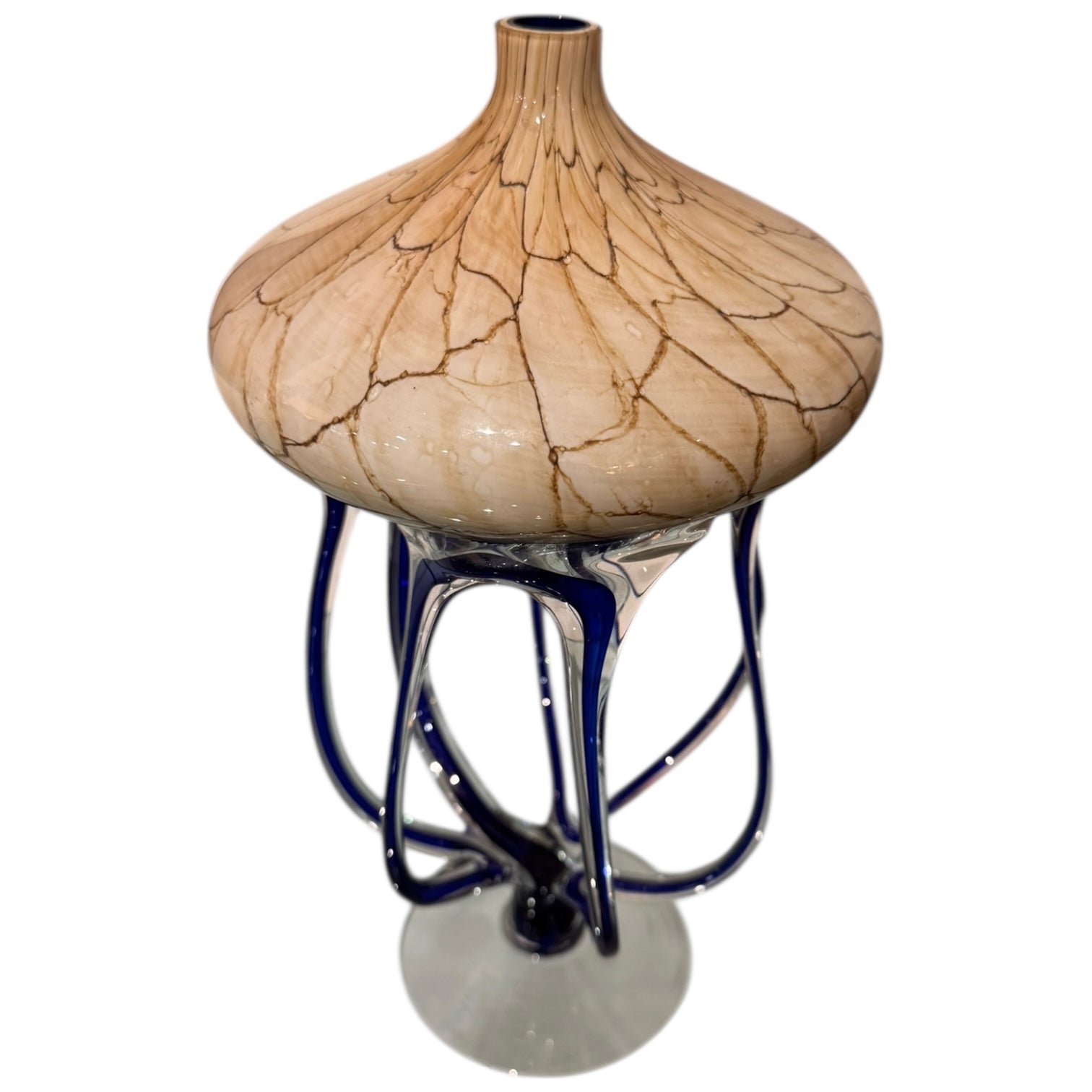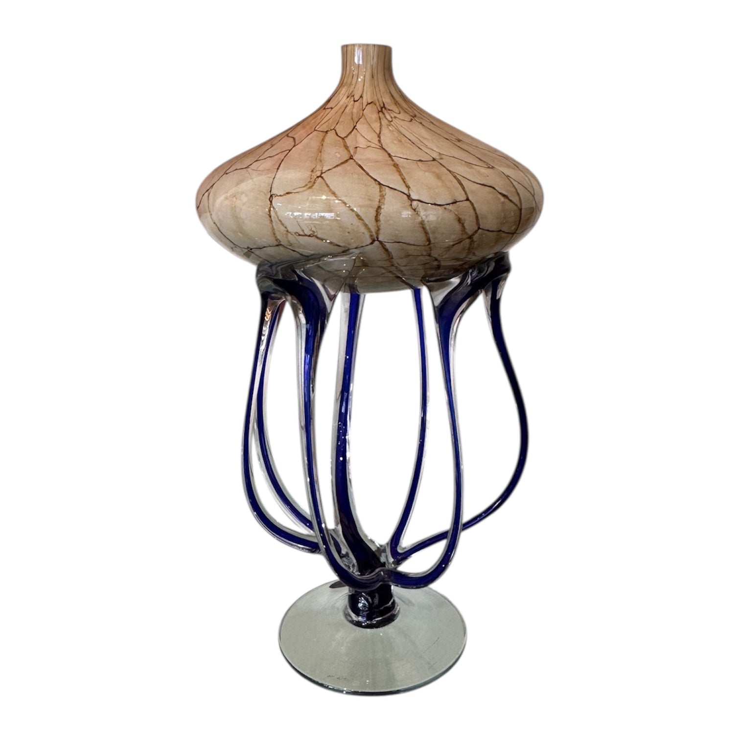 Abstract Jellyfish blue tentacles beige tones top with clear glass base vase