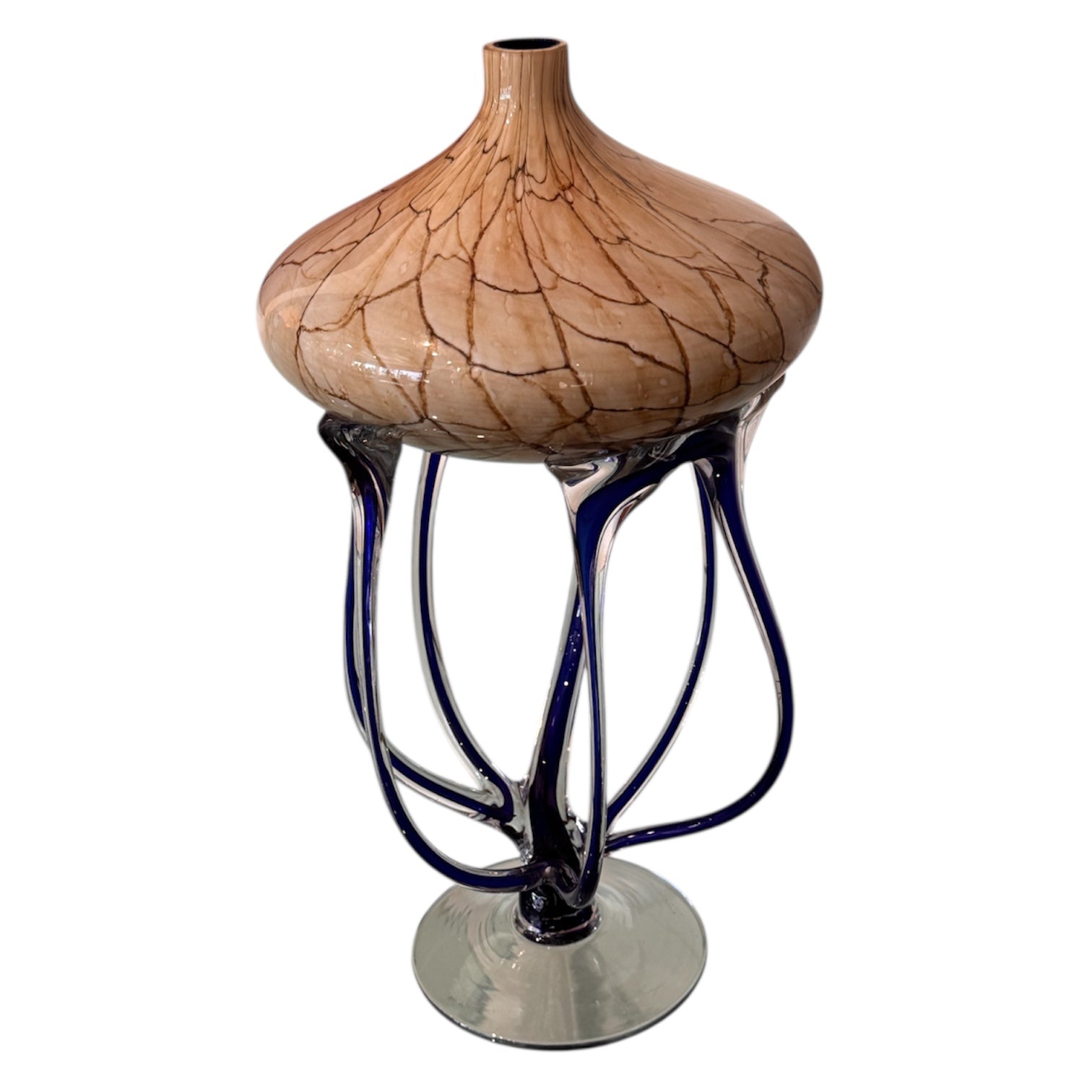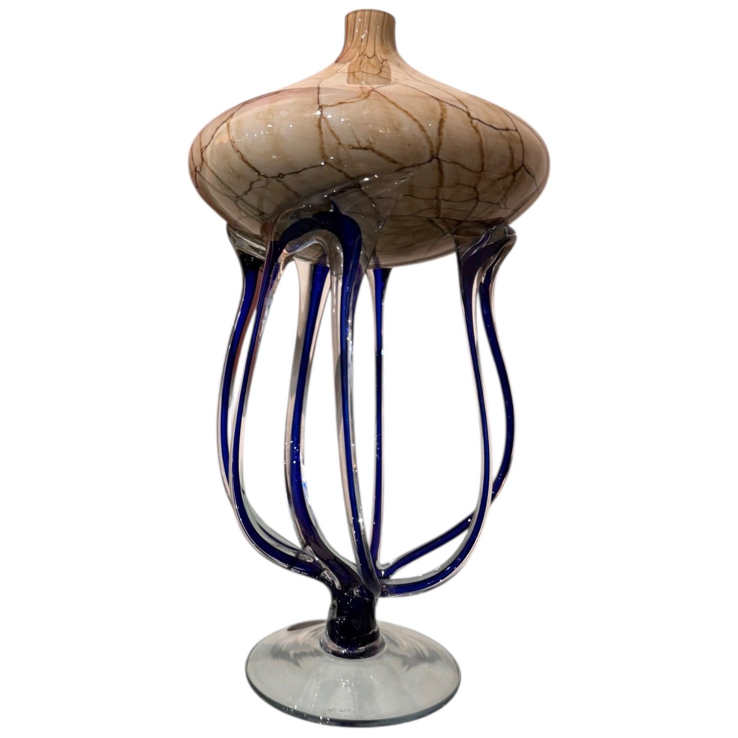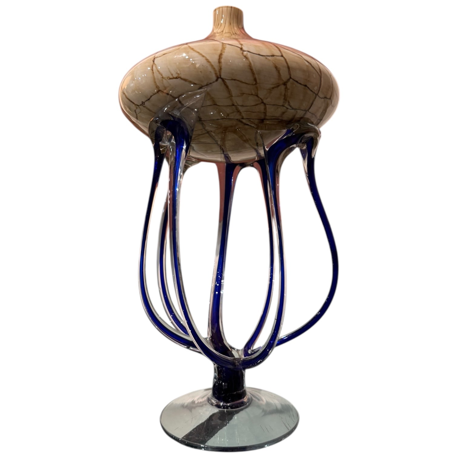 Abstract Jellyfish blue tentacles beige tones top with clear glass base vase